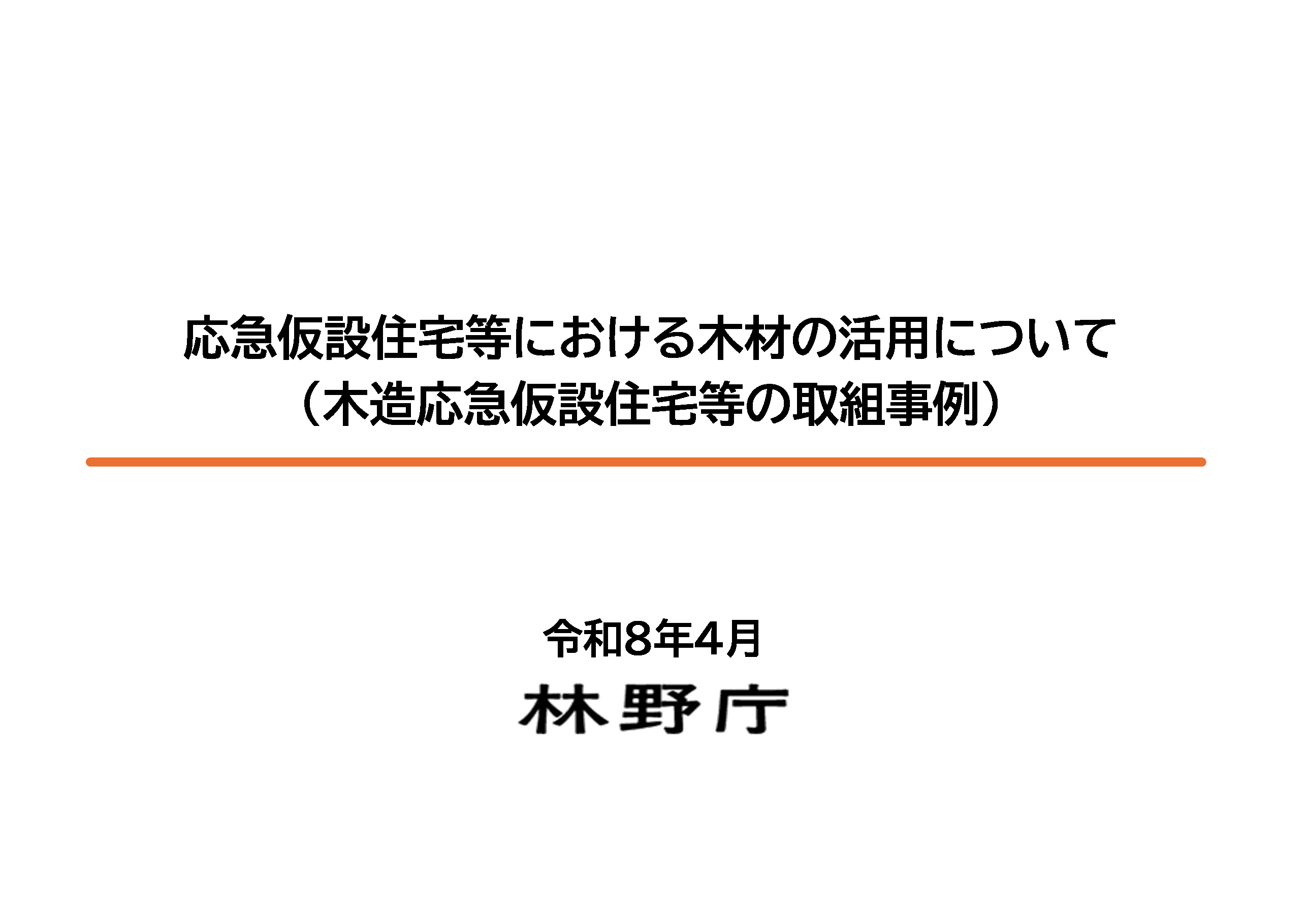 一般社団法人日本オフサイト建築協会(所在地:東京都千代田区、代表理事:長坂俊成)は、この度、林野庁が令和8年4月に全国の自治体向けに作成した『応急仮設住宅等における木材の活用について(取組事例)』において、木造応急仮設住宅の供給に係る主な団体の一つとして紹介されたことをお知らせいたします。