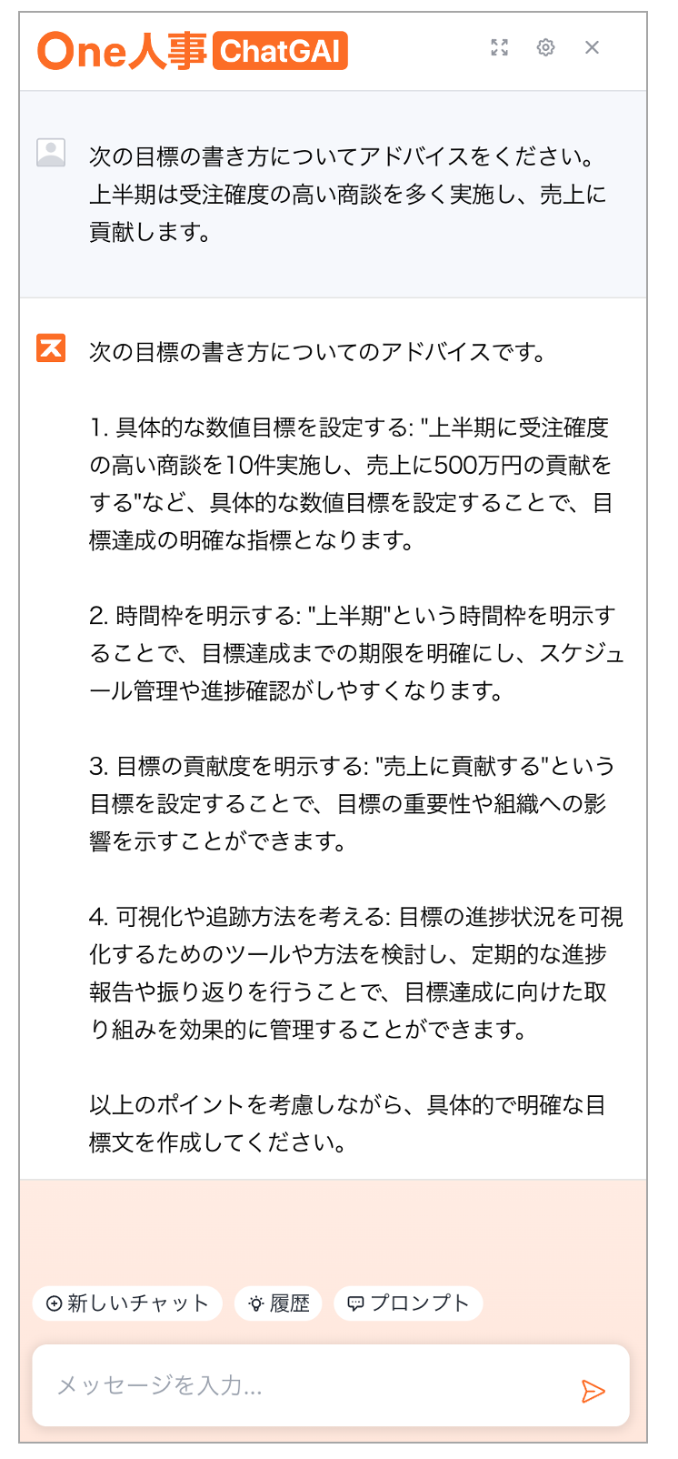 今回リリースされる『One人事 ChatGAI』は、タレントマネジメントシステムとの親和性が高く、人事目標・評価と照らし合わせて従業員のパフォーマンス管理や改善を提案し、負荷の高い業務の効率化や、人事評価の客観性と多角的な視点を促すことが可能になります。