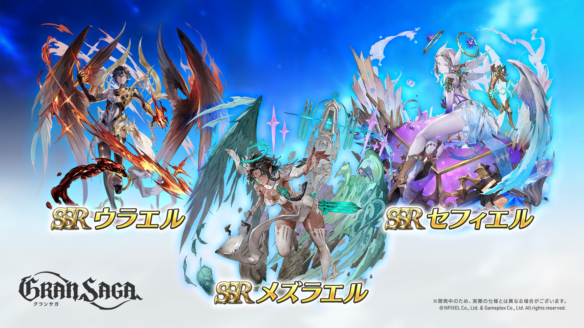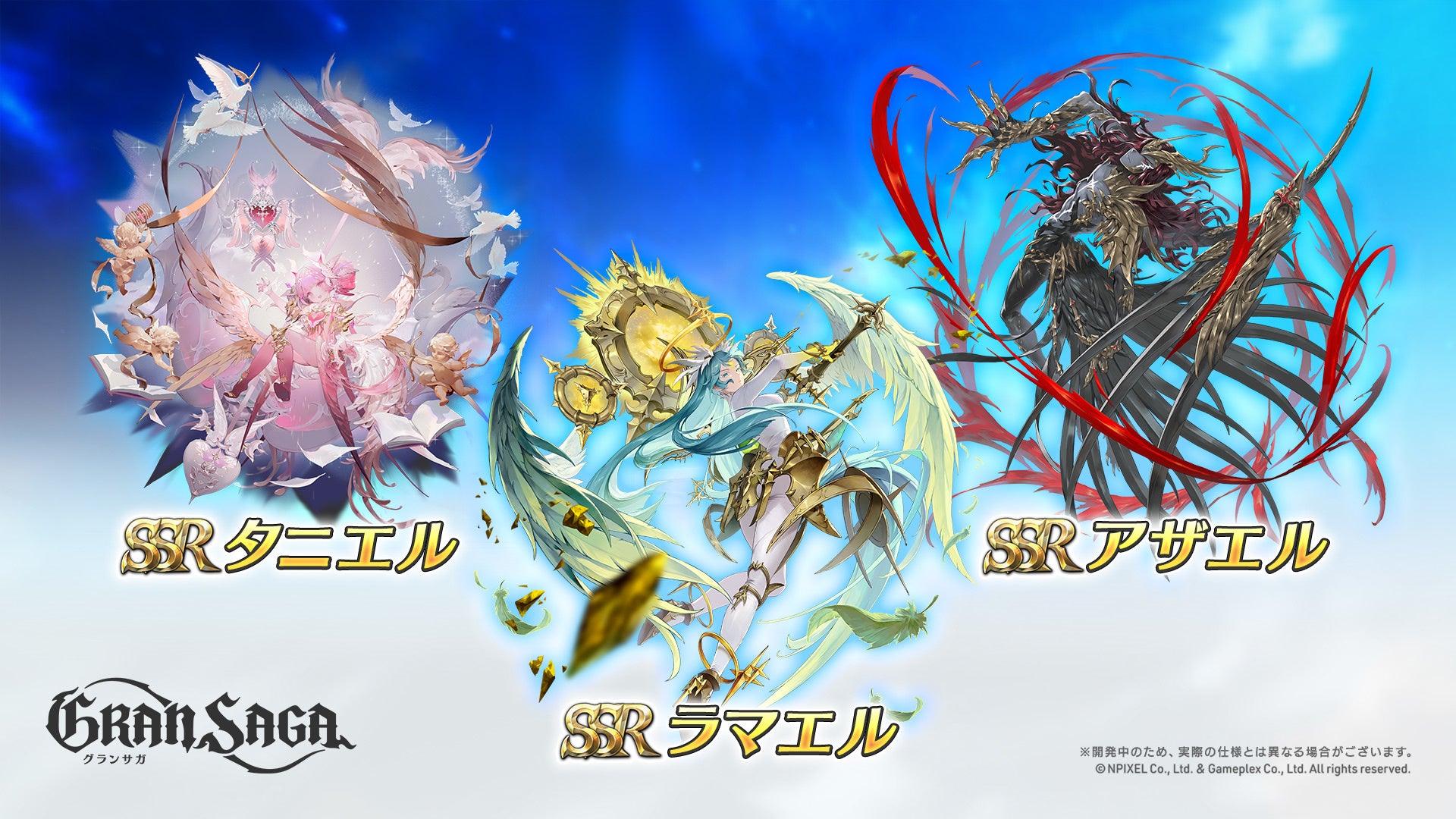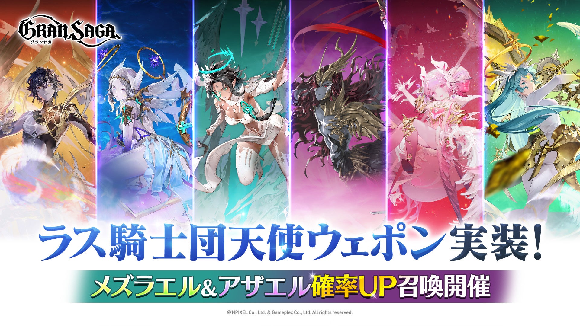 今回登場する天使グランウェポンは、ラス騎士団(ラス、セリアード、キュイ、ナマリエ、カルト、ウィン)6人のグランウェポンとなります。いずれも強力な変身グランウェポンとなりますので、スキルや性能に関してはゲーム内でチェックしてみてください!