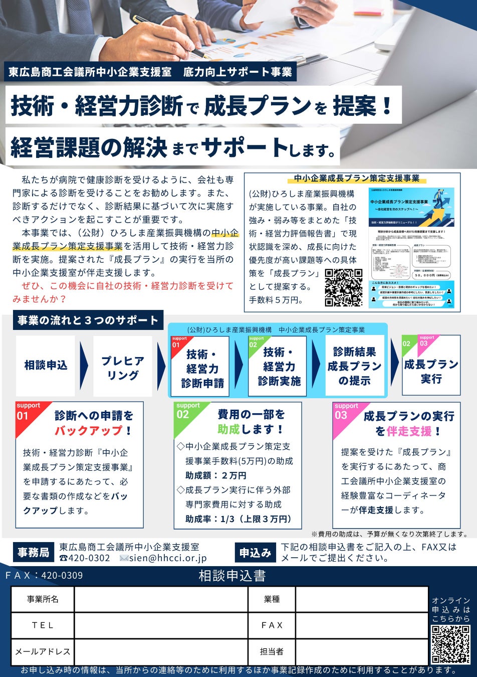 (公財)ひろしま産業振興機構が行う「中小企業成長プラン策定支援事業」を活用して、技術・経営力診断を実施。提案された「成長プラン」の実行を東広島商工会議所 中小企業支援室が伴走支援します。ぜひ、この機会に自社の技術・経営力診断を受け、成長プランに取組んでみませんか?