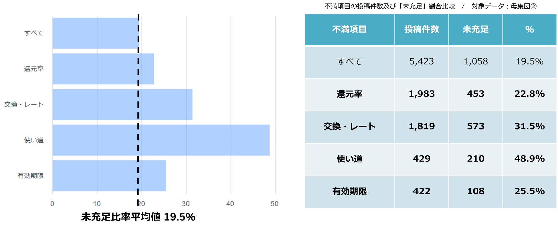 母集団②を対象に、不満項目別の投稿件数と「未充足」割合を比較した。投稿件数は「還元率」「交換・レート」が上位となった。「未充足」の割合は、全体平均が19.5%であったのに対し、全ての不満項目でそれを上回った。