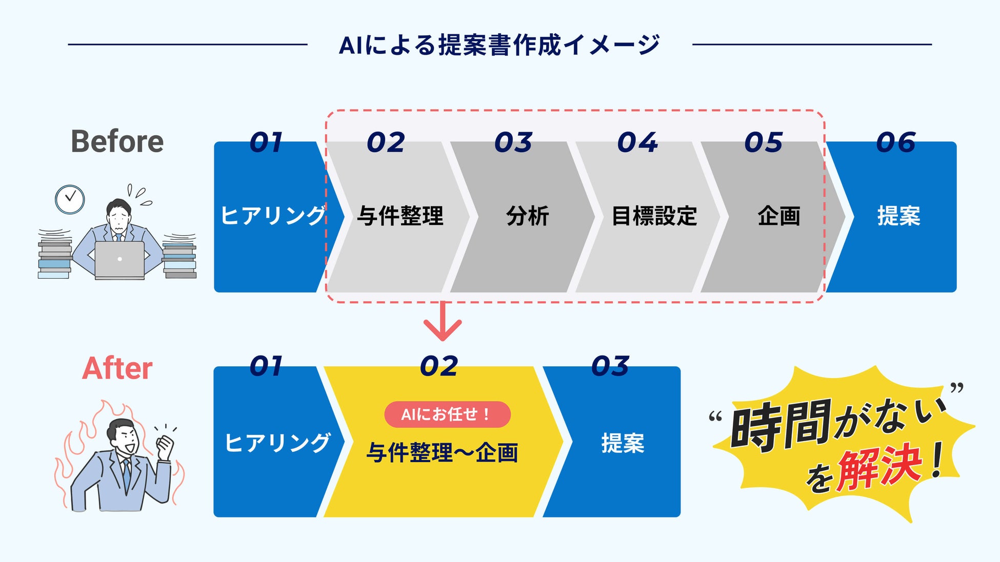 このような業界の実情を踏まえ、当社は更なる働き方の効率化を実現するため、AI技術を活用して提案書の作成を自動化する新サービスの開発を決定。これにより、営業担当者やマーケターが真に価値ある業務に専念できる環境の構築を目指しています。