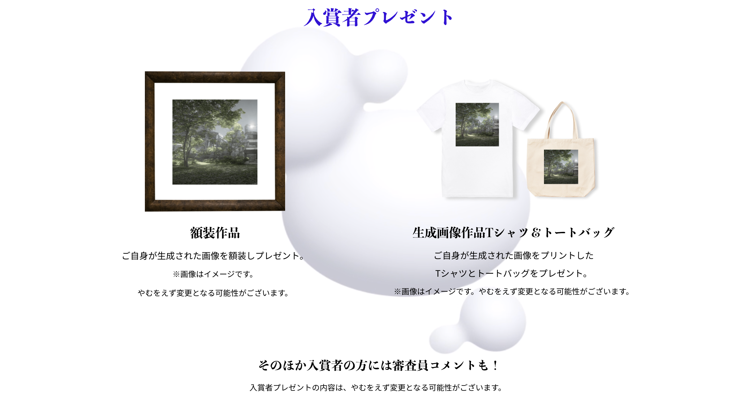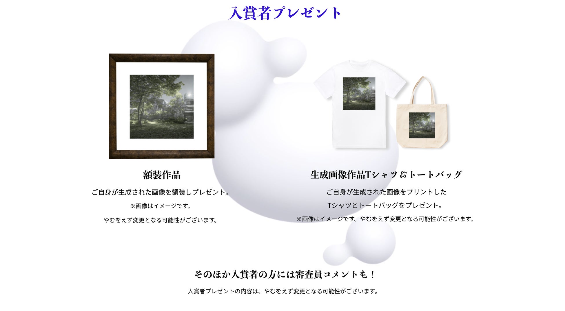 また、グランプリ受賞作品は、生成したAI絵画のプリントTシャツ、トートバック、コメント、額装された画(仮)など、オリジナル商品を贈呈いたします。
