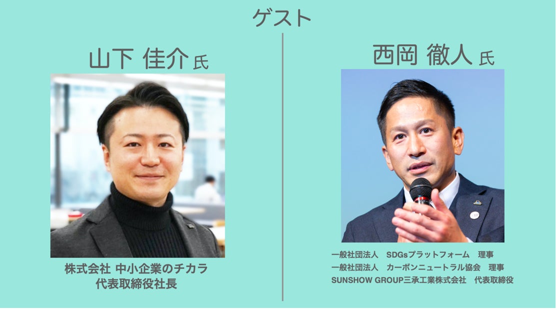 またゲストには、SDGs専門家として一般社団法人 SDGsプラットフォーム 理事 西岡様、本プロジェクトの主催である弊社代表取締役山下が登壇し、企業だけでなく個人単位でできることや考え方、向き合い方などトークディスカッションを行いました。