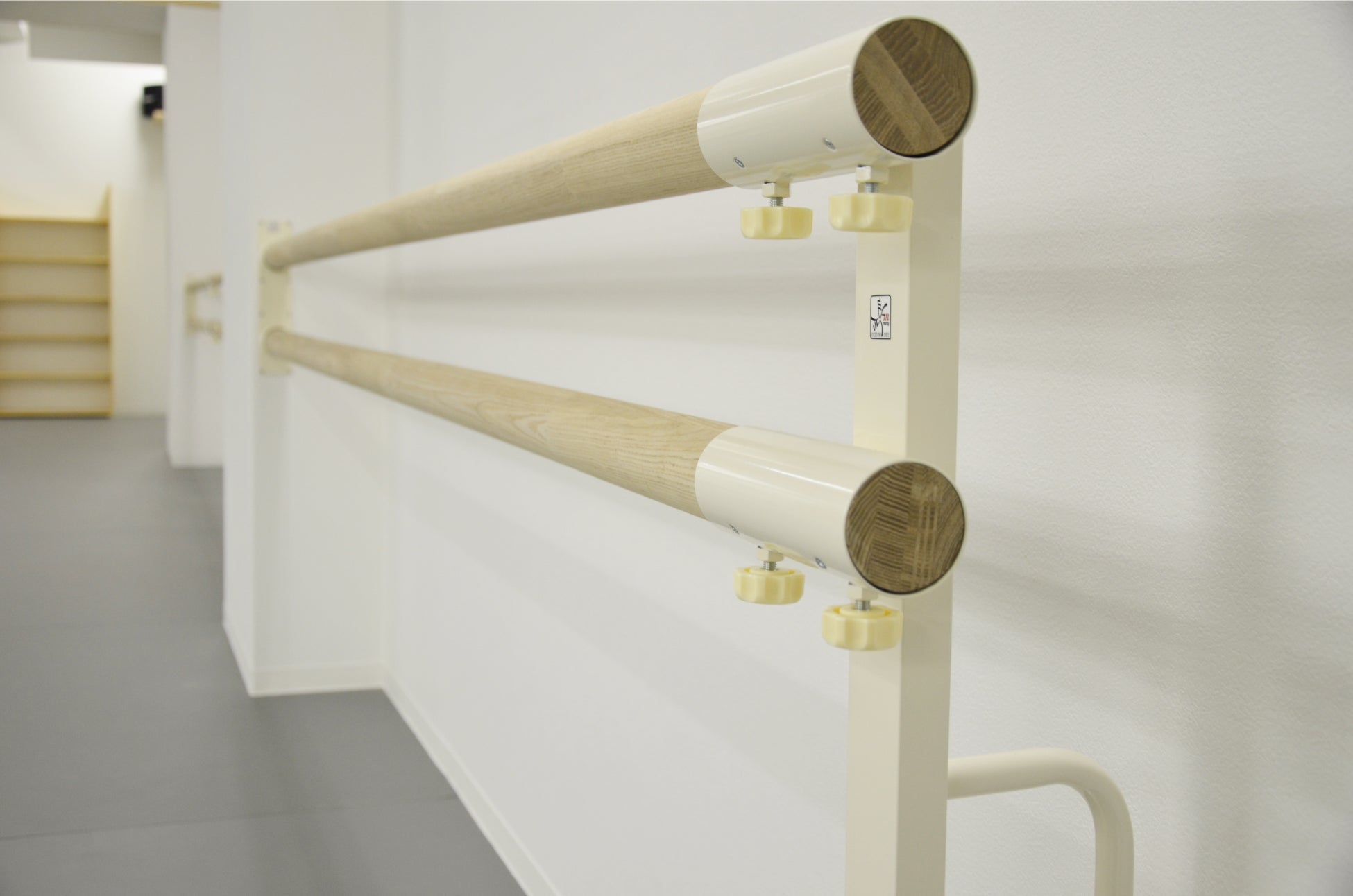 防滑性、柔軟性、摩耗性、クッション性に優れた本格リノリューム、機能性・デザイン性を考慮し、踊りへの集中を高める照明、木の風合いをそのまま活かした集成材のバレエバー、レッスン空間を広く、明るく演出するダンスミラーを使用し、バレエダンサーの足を守り、気持ちよく練習できる環境を整えています。