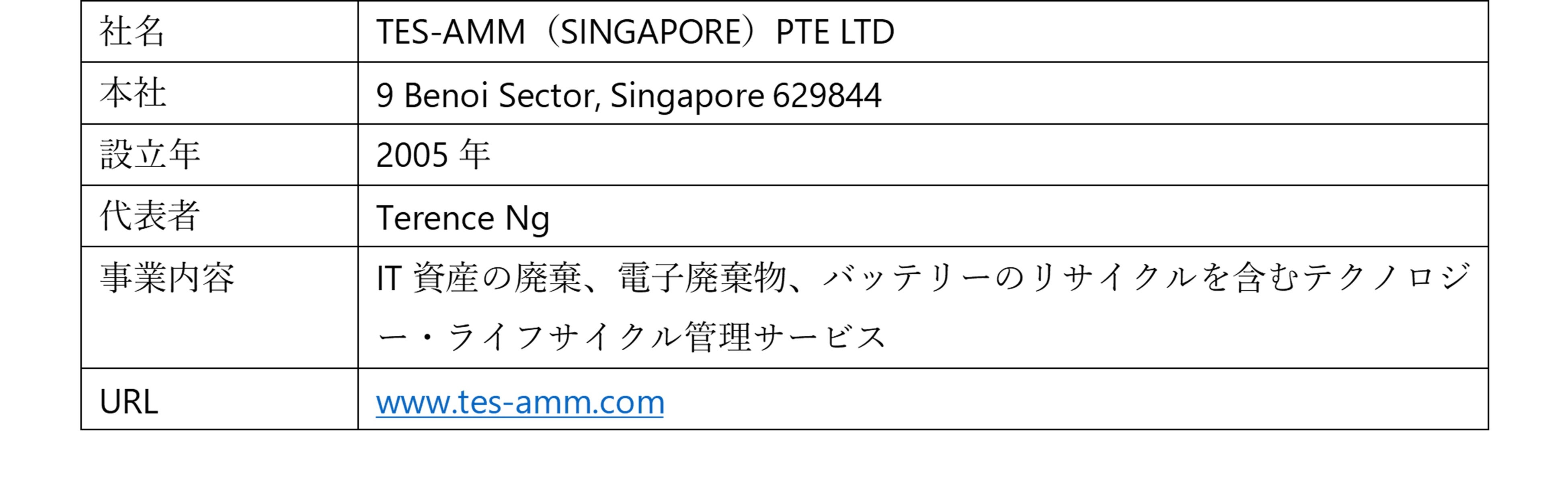 TESは、2005年に設立された、持続可能な技術サービスと電子機器や部品の導入から廃棄処分を管理するお客さまのニーズに合わせたソリューションを提供するグローバル企業です。製品の導入・リユース・リサイクル・廃棄処分に至るまで、ライフサイクル全体にわたり総合的なサービスを提供しています。使用済み電池から希少素材を高い純度で抽出し、製造サプライチェーンで再利用できる状態にするなど、リサイクル資産の価値を最大限に活用するための新しい事業プロセスの開発も行っています。