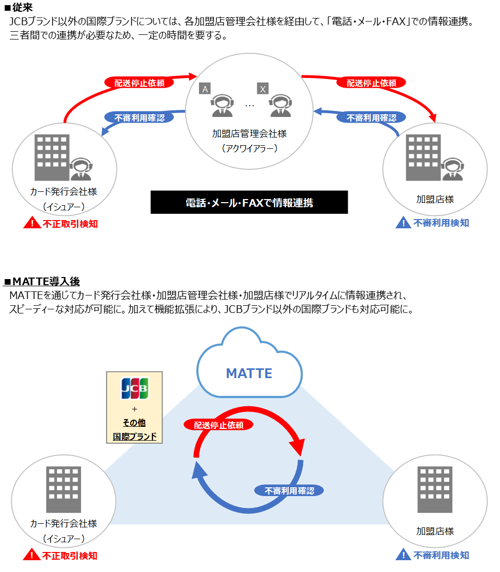 今回「MATTE」の機能拡張により、JCBブランド以外の国際ブランドの取引に関しても、対応が可能となります。具体的には、カード発行会社様での不正検知または、加盟店様での不審な利用を検知したタイミングで、「MATTE」を通じて加盟店様・カード発行会社様間でリアルタイムに情報連携や配送停止依頼が可能となります。