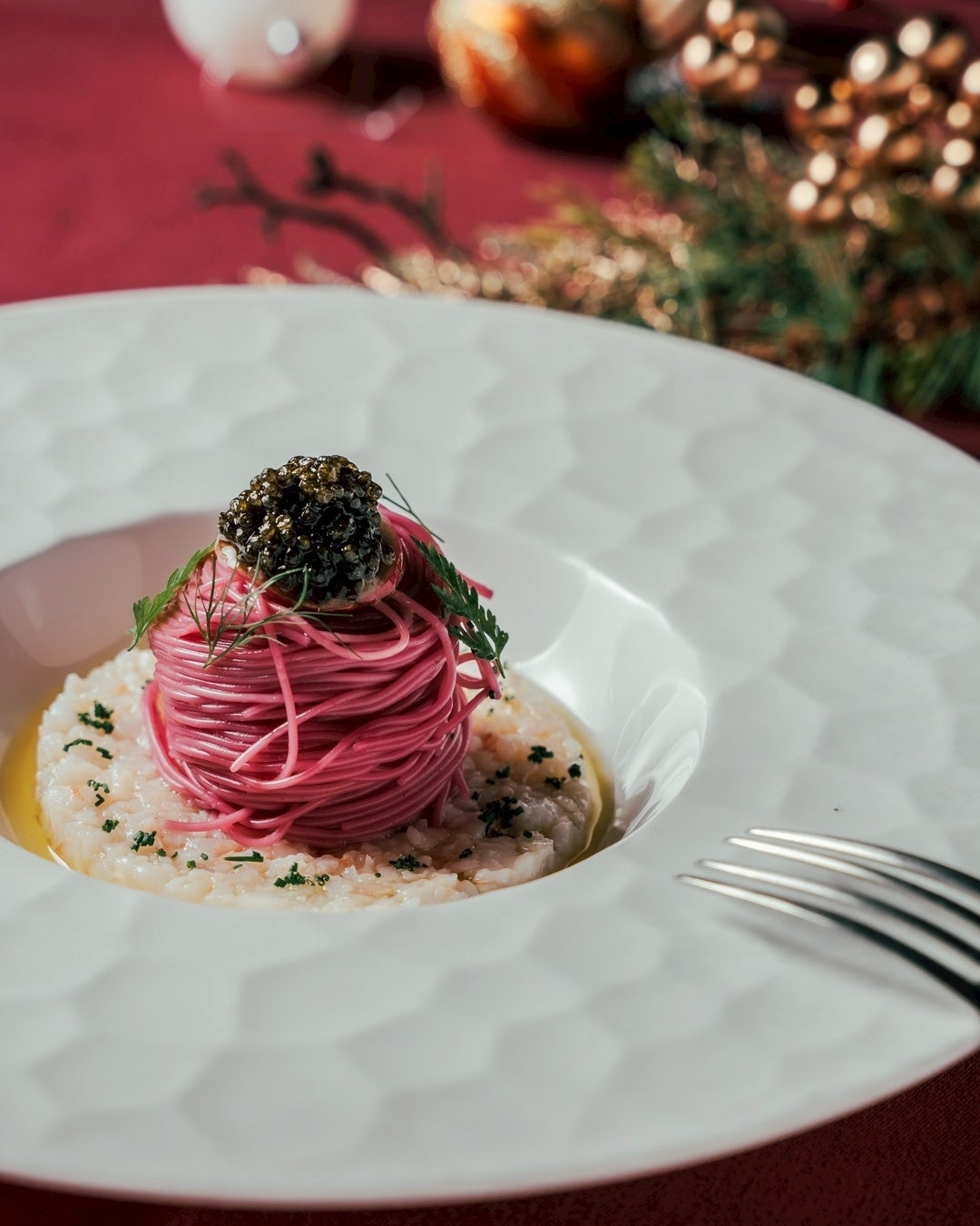 ハイブリッドキャビアとビーツの冷製カペッリーニ