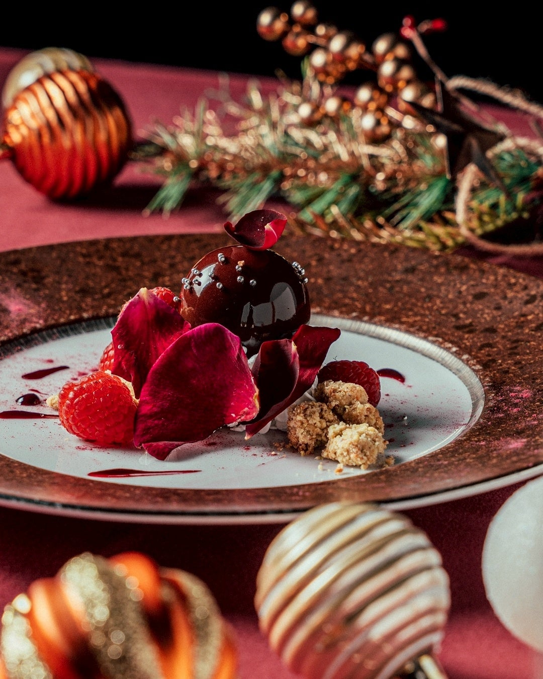 クリスマスツリーのオーナメントに見立てたラズベリーとチョコレートのムース