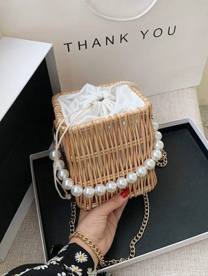 商品名 :ミニ ドロースト リングデザイン パール ストラップ わら編みバッグ