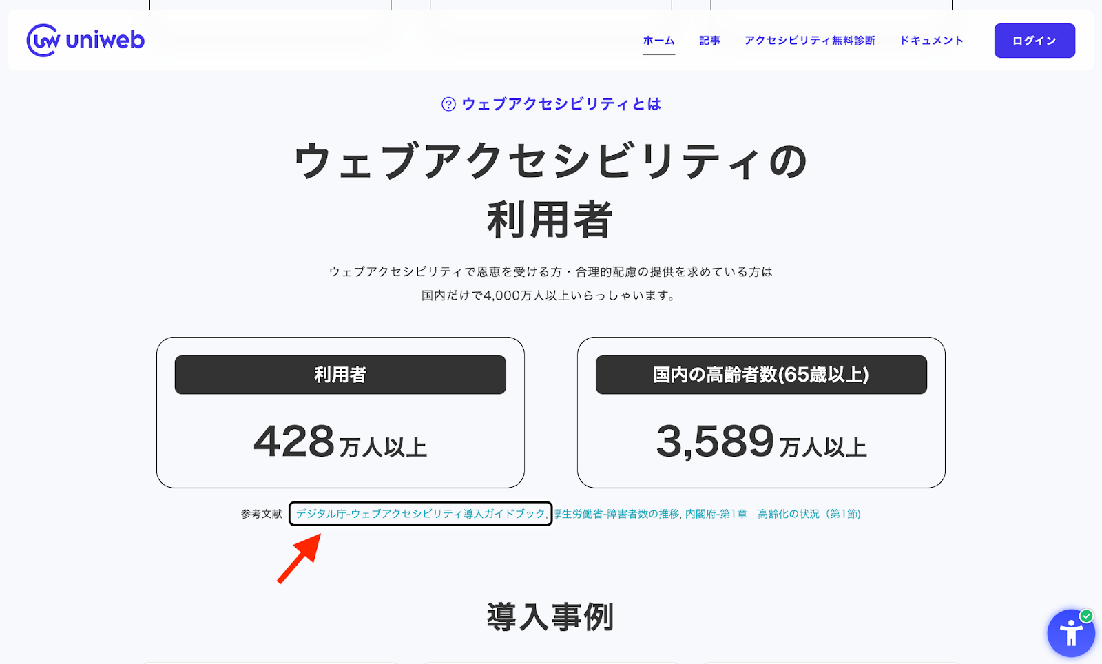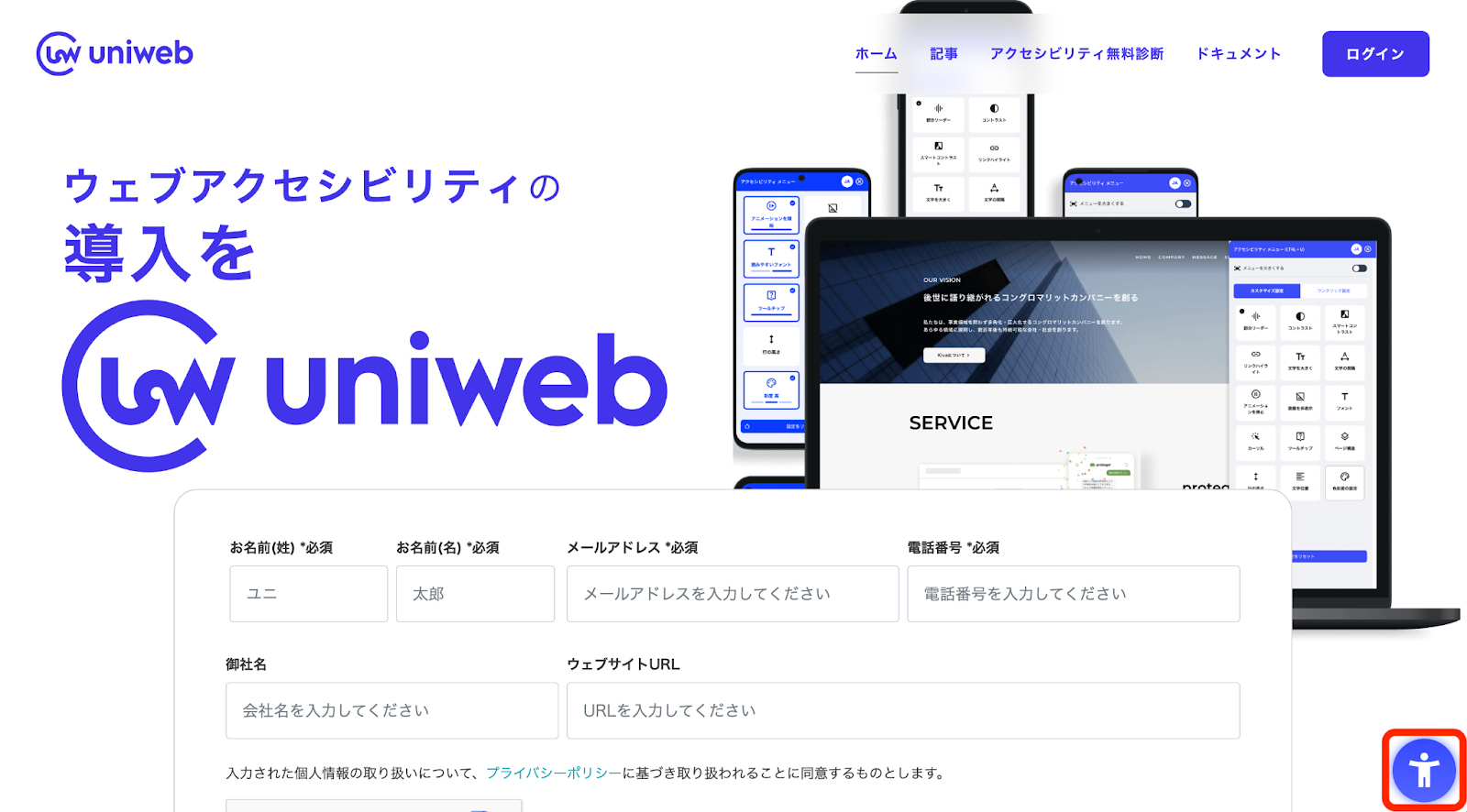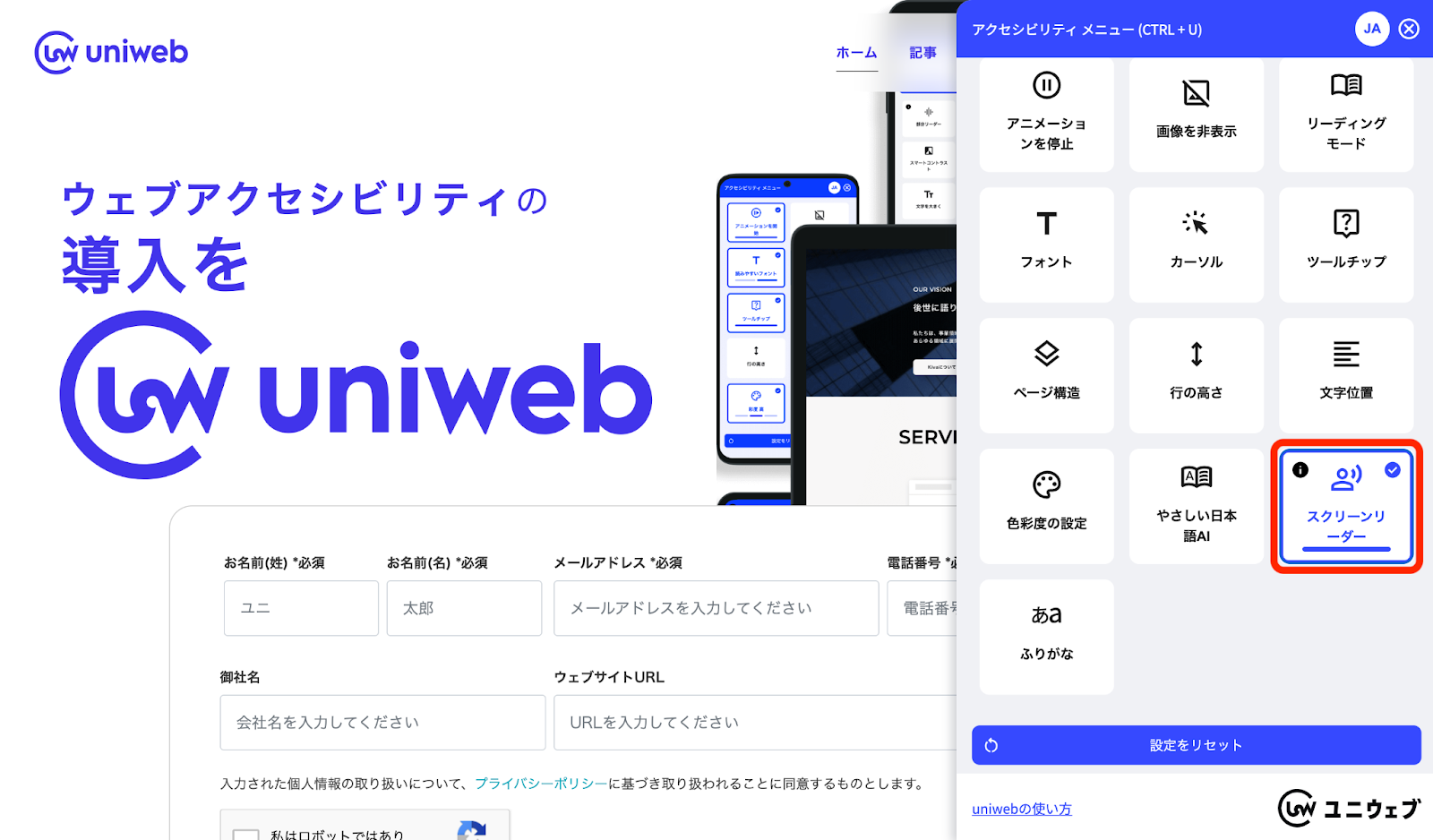 ユニウェブは、すべてのウェブサービスにコード一行を追加するだけで「導入当日」にウェブアクセシビリティ機能をサポートします。