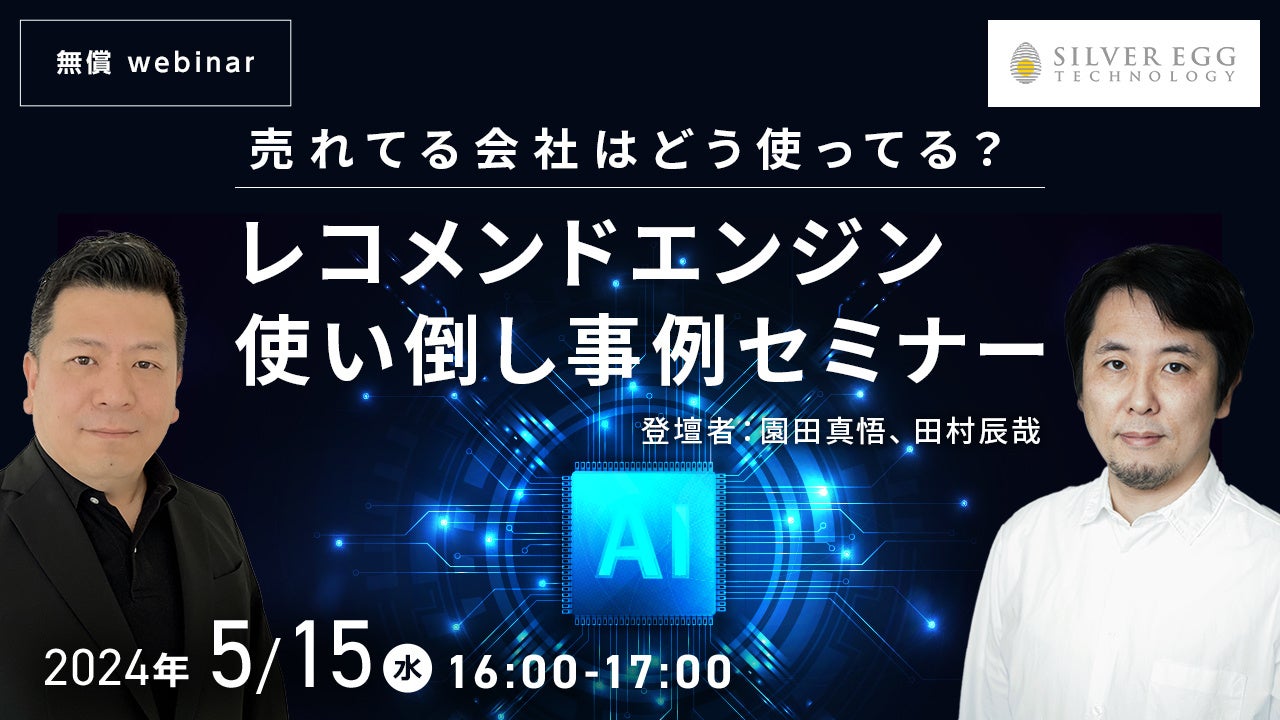 AI技術をベースとしたデジタルマーケティングサービスを提供するシルバーエッグ・テクノロジー株式会社(本社:大阪府吹田市、代表取締役社長&CEO:トーマス・フォーリー、証券コード 3961、以下 シルバーエッグ)は、2024年5月15日(水)にウェビナー「売れてる会社はどう使ってる? レコメンドエンジン使い倒し事例セミナー」を開催します。