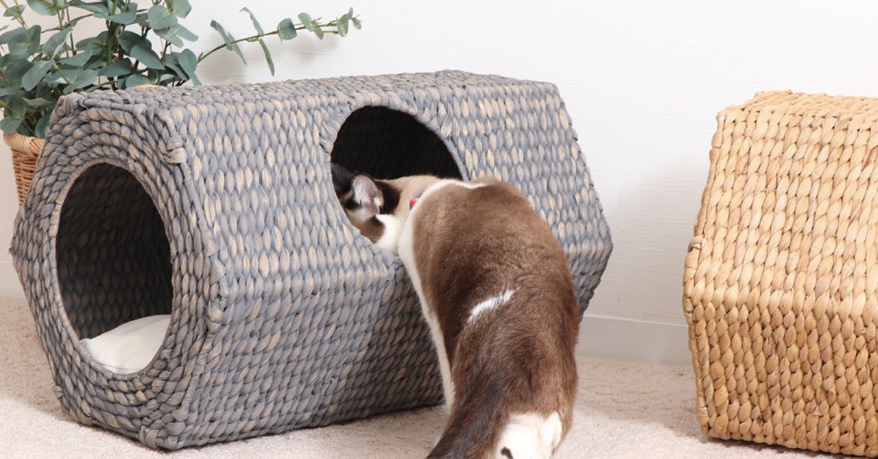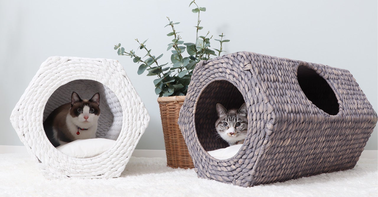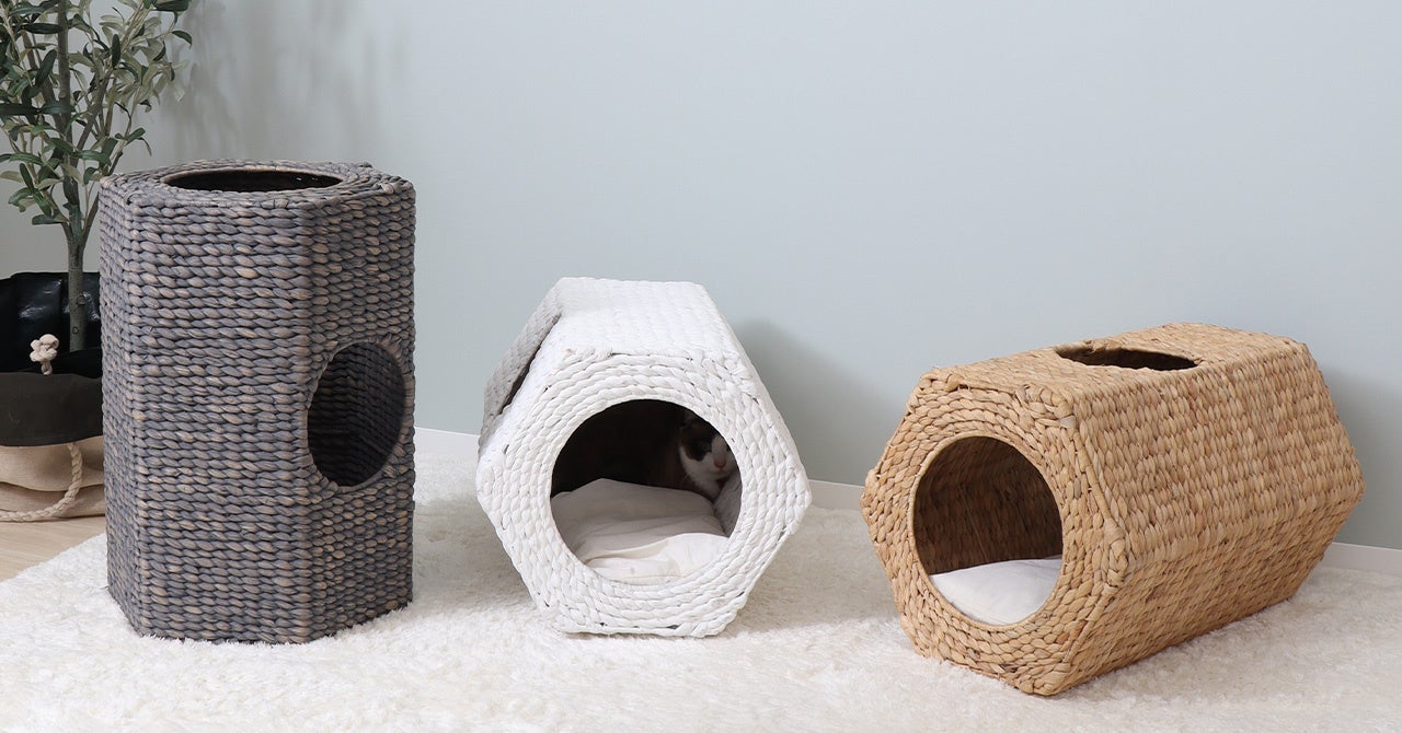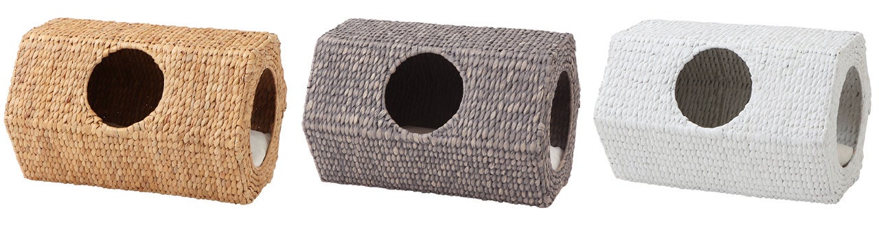 家具の企画、製造、販売を行う株式会社ヤマソロ(本社:兵庫県小野市、代表取締役社長:山本 一郎)が運営するインテリアECショップ『ヤマソロ公式 A LA MODE(アラモード)』から、どことなく「ドカン」を彷彿させる六角柱のカタチがユニークなペットハウス「nenne-kuusi-(ネンネクーシ)」が登場です。天然素材ウォーターヒヤシンスを使い柔らかい印象ですが、しっかりした枠組と安定した形状で縦にしても横にしても使うことが出来ます。内部はゆったりとしたサイズで2匹の猫ちゃんも仲良く入れ、2つ3つ...と合わせれば、猫ちゃんの大好きなトンネル遊びが楽しめます。多頭飼いのおうちにもピッタリな、遊んで眠れるペットハウスです。カラーはお部屋のインテリアに合わせやすい「ナチュラル」「グレー」「ホワイト」の3色展開。ペットとの暮らしがもっと楽しくなるペットハウス「nenne-kuusi-(ネンネクーシ)」は、ヤマソロオフィシャルストアにて販売しています。