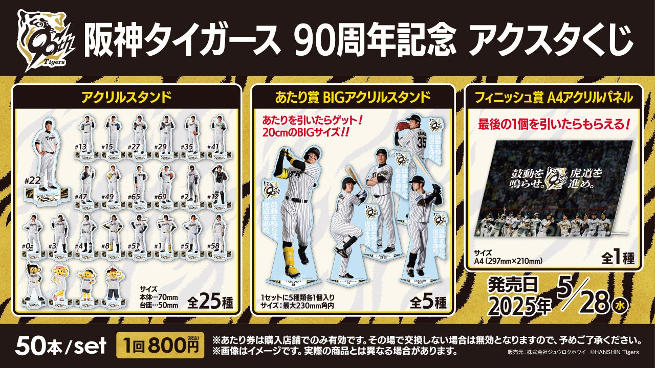 株式会社ジュウロクホウイ(本社:東京都千代田区、代表取締役:赤松 武雄)は、株式会社阪神タイガース監修のもと、2025年で球団創設90周年を迎えたことを記念した「阪神タイガース90周年記念アクスタくじ」を、2025年5月28日(水)に発売することを決定いたしましたのでお知らせいたします。販売は関西エリアを中心とした書店などにて店頭販売となります。