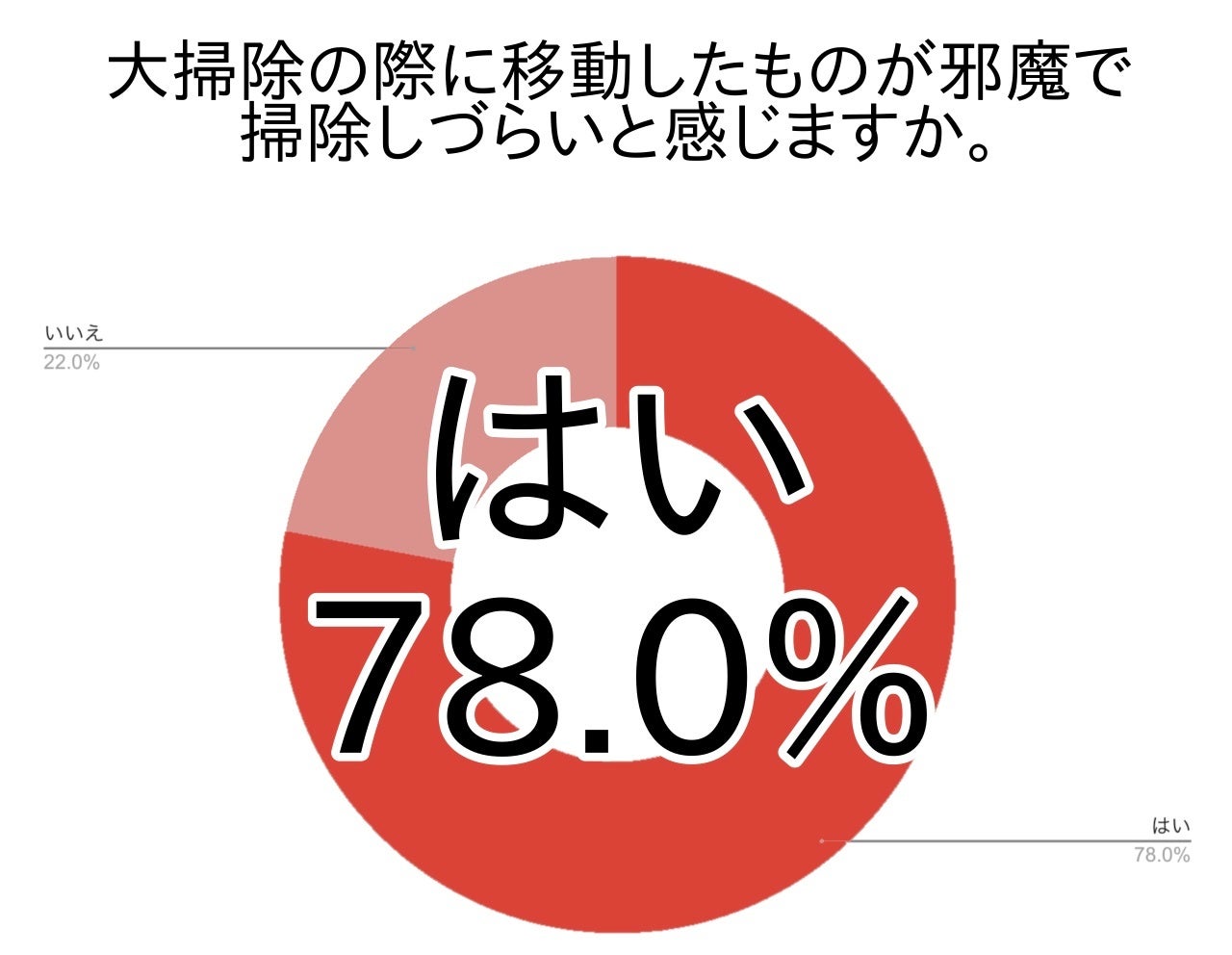 大掃除は掃除そのものだけではなく、掃除をするための準備・掃除ができる環境の整備もなかなか大変で、中でも特に問題となるのは荷物の移動や置き場所の確保です。先ほどの質問のように掃除がしづらく感じる方が多いだけでなく、アンケートでは、ものの移動や出し入れ等だけで時間を取られてしまうと感じている方が8割弱(関東77.1%・全国77.3%)に上ることがわかりました。