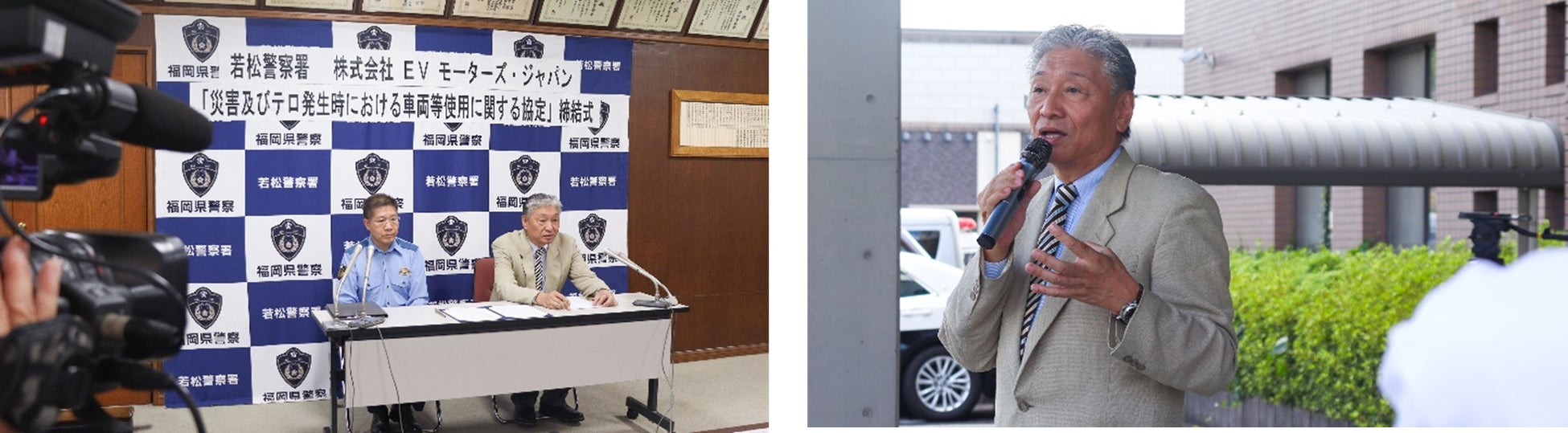 株式会社 EV モーターズ・ジャパン (本社:福岡県北九州市、代表取締役社長:佐藤 裕之) はこの度、若松警察署様(所在:福岡県北九州市、署長:中島 健)と「災害及びテロ発生時における車両等使用に関する協定」を締結し、2024年7月30日に若松警察署様にて締結式を開催いたしました。