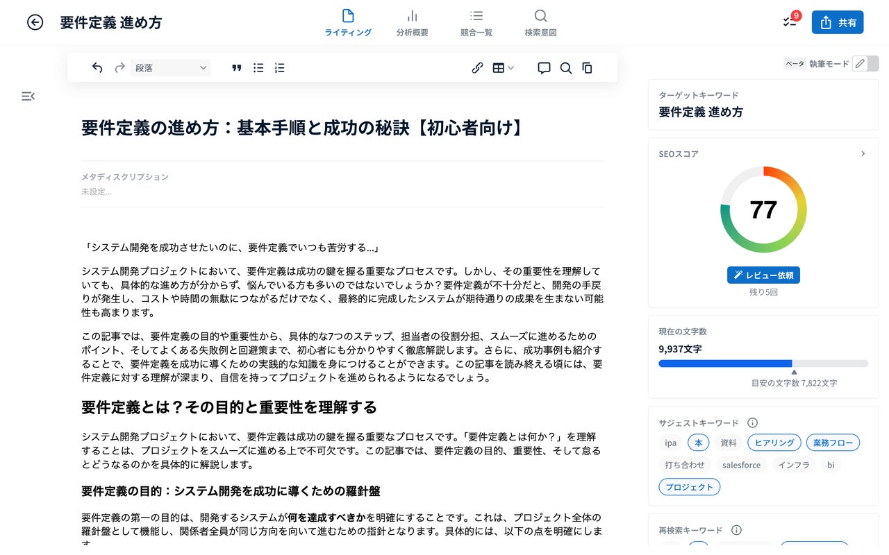 分析時に参考にしたキーワードボリュームや検索意図を踏まえながら、実際の見出し構造を固めていきます。新ライティング画面では、見出し数の推奨値や文字数の目安を即座に確認できるため、検索エンジンが評価しやすい記事設計を容易に行えます。ユーザーが読みやすい分量や構成を提示できることで、ページ離脱率の低減や読了率の向上も期待できます。