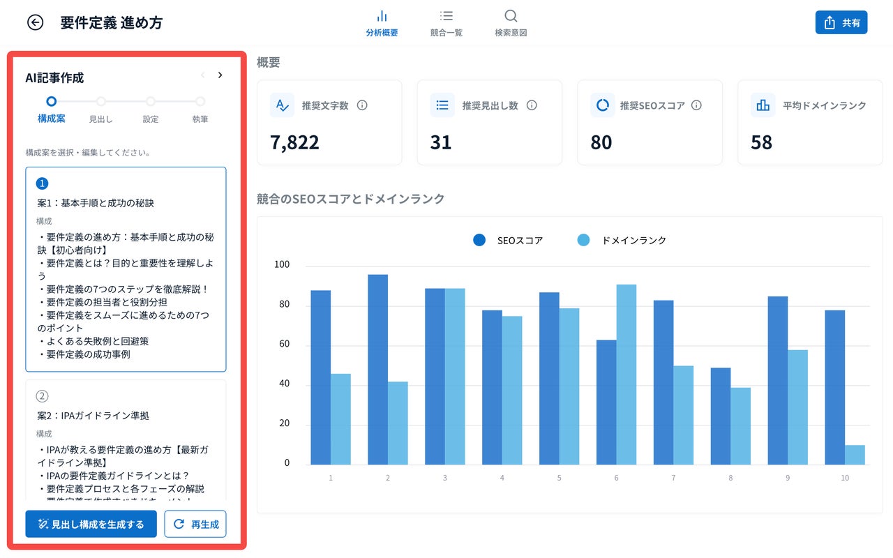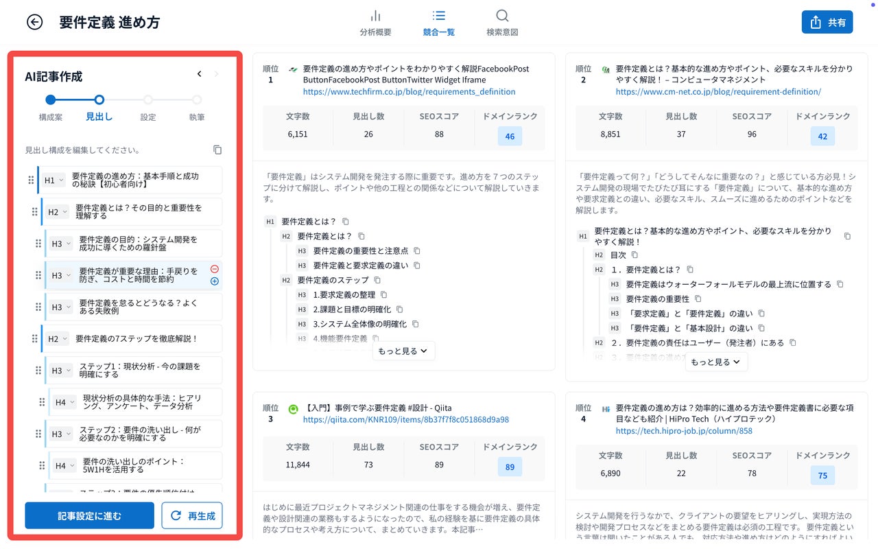 分析結果をもとに、どのような見出しや内容を組み立てるかを仮組みする段階です。新ライティング画面では「分析レポート」のタブを開いたまま構成案を練ることができるため、参照とアイデア出しを同時進行できます。たとえば、競合サイトが網羅しているテーマや見出し数を見比べながら、自社が狙う独自の切り口を考えられるようになります。