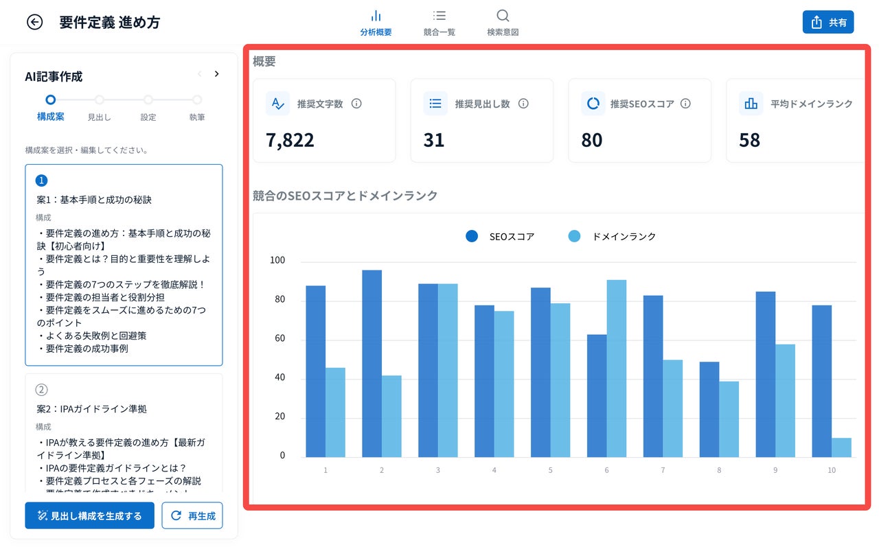 「推奨文字数」や「平均SEOスコア」など客観的な指標を常に参照しながら構成案や見出しを練ることで、ライターごとの認識の相違を減らせます。社内チームで記事を分担する場合でも、統一した品質を保ちやすくなります。