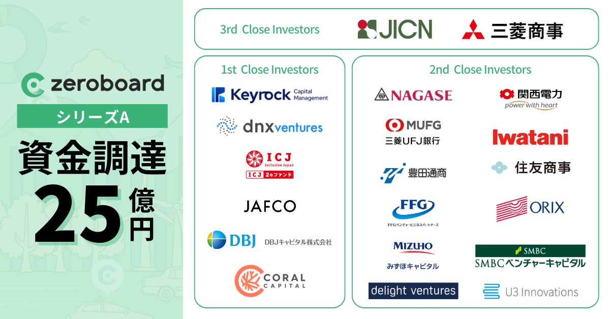 GHG(温室効果ガス)排出量算定・開示・削減を支援するソリューション「zeroboard」を提供する株式会社ゼロボード(東京都港区、代表取締役:渡慶次 道隆、以下「当社」)は、2023年2月15日に発表したシリーズAセカンドクローズの資金調達が完了したこと、ならびにサードクローズとして、三菱商事株式会社と株式会社脱炭素化支援機構を引受先とした第三者割当増資を実施し、2023年3月23日にシリーズA総額で約25億円の資金調達が完了したことをお知らせします。会社設立から1年6ヶ月での累計調達額は約28億円となりました。