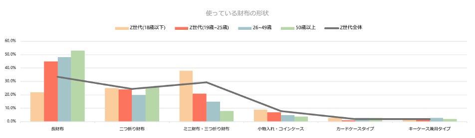 調査対象者に対し、現在最も使用している財布の形について聴取したところ、Z世代は他の世代に比べ「長財布」の利用率が低く、コンパクトな「ミニ財布・三つ折り財布」の利用率が高いという結果が出た。