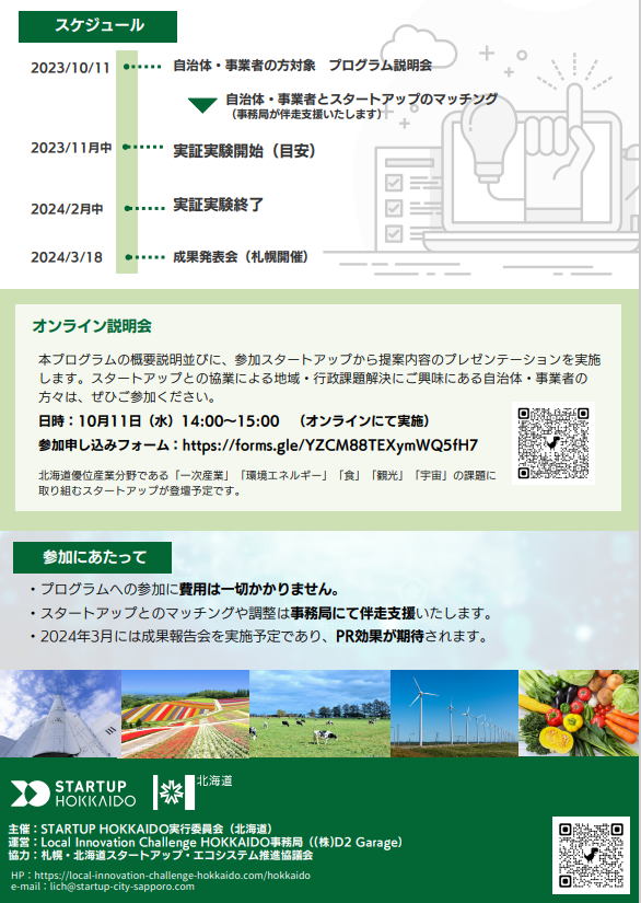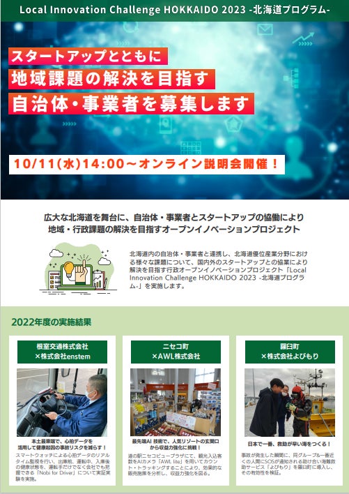 STARTUP HOKKAIDO実行委員会(事務局:北海道ほか)では、道内へのスタートアップ集積に向け、道内の自治体・事業者と連携し、北海道優位産業分野における様々な課題について、国内外のスタートアップとの協業により解決を目指す行政オープンイノベーションプロジェクト「Local Innovation Challenge HOKKAIDO 2023 -北海道プログラム-」を実施します。
