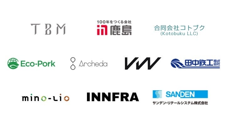 左上から、株式会社TBM、鹿島建設株式会社、合同会社コトブク、株式会社Eco-Pork、株式会社Archeda、Value way株式会社、田中鉄工株式会社、株式会社mino-lio、INNFRA株式会社、サンデン・リテールシステム株式会社