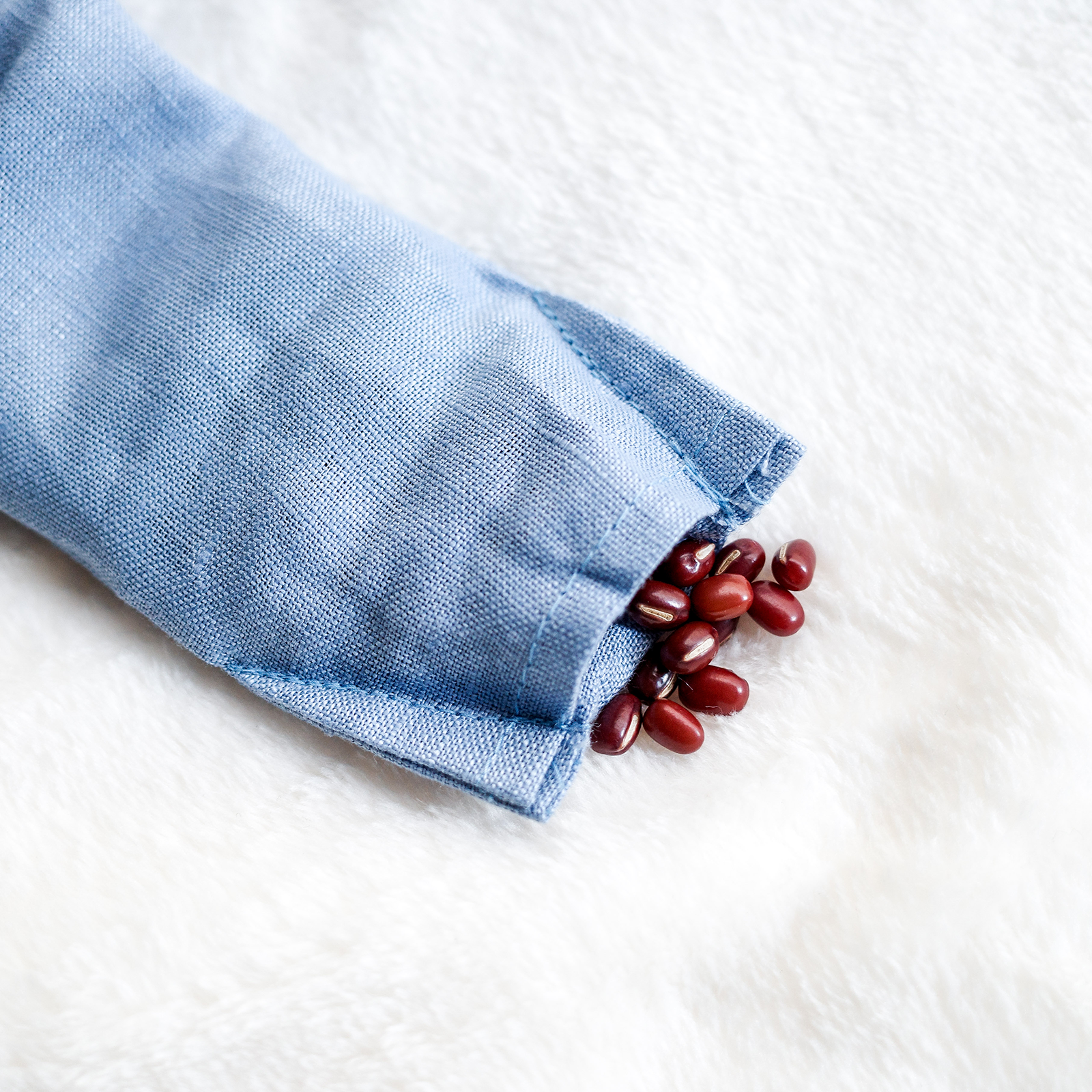 「INOME」の小豆入り内袋には、小豆がこぼれ出てこないようにフラップを設けています。だけど完全に縫い留めてはいないのは、小豆を交換して長く使ってもらいたいから。