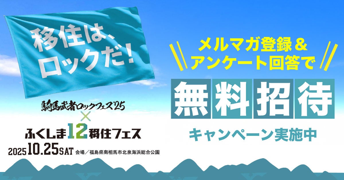 福島12市町村への移住を検討している方や関心をお持ちの方を対象に、「騎馬武者ロックフェス2025×ふくしま12移住フェス」へ無料招待の募集を実施中です。全国からサーファーたちが訪れる海浜公園での音楽ライブを楽しみ、“ロック魂”あふれる移住者たちと出会い、語り合える体験型ブースも設置!申し込み方法は「ふくしま12市町村移住支援センター」が運営するメルマガに登録し、移住に関する簡単なアンケートにご回答するだけです。応募者多数の場合は選考とします。是非、ご応募をお待ちしています。