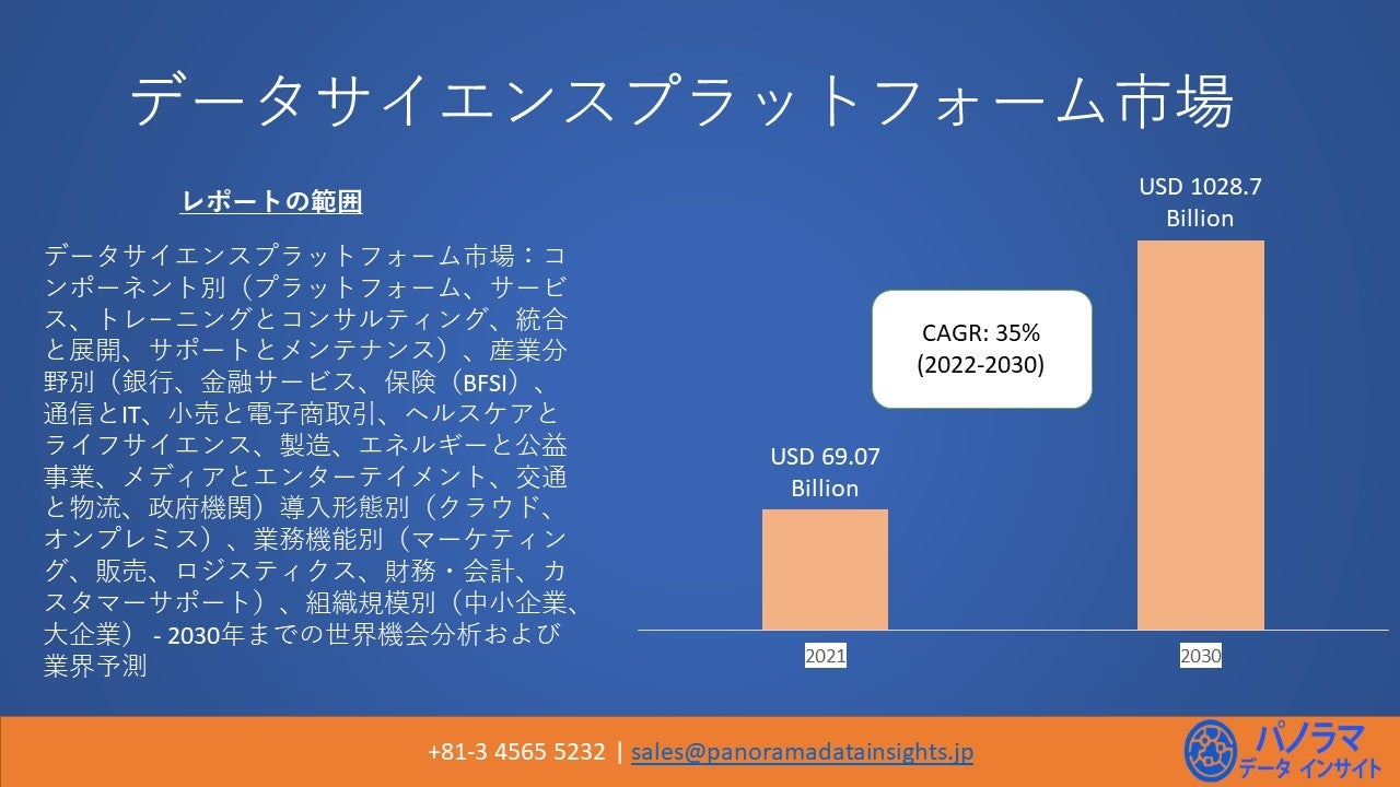 データサイエンスプラットフォームの世界市場規模は、2021年に690. 7億米ドル、2030年には10287億米ドルに達すると予測され、2022年から2030年の予測期間中に複合年間成長率(CAGR)で35%成長するとされています.