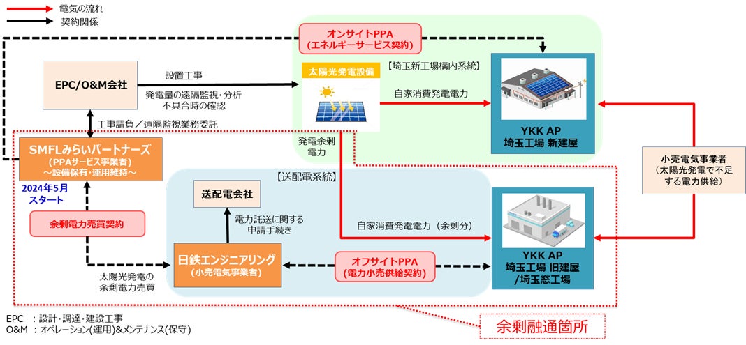 YKK APでは工場で使用する電力の再エネ電力化を進めており、2023年10月にSMFLみらいパートナーズをPPAサービス事業者として埼玉工場新建屋でパネル容量約1,700kW規模のオンサイトPPAの運用を開始しておりましたが、埼玉工場新建屋単独では太陽光で発電される電力の半分程度しか活用できていないという課題がありました。このため、日鉄エンジニアリングが小売電気事業者として、東京電力パワーグリッド株式会社の送電網を経由して、埼玉工場旧建屋と埼玉窓工場へこの余剰電力を供給し100%有効活用することで、YKK AP全体での再エネ電力使用比率を高めることを可能にしました。