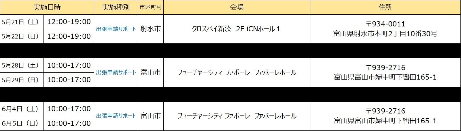 ※開催場所の調整状況や新型コロナウィルスの感染状況等により、「出張申請受付」及び「出張申請サポート」の開催を中止・延期、または実施内容が変更となる可能性がございます。