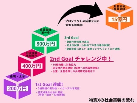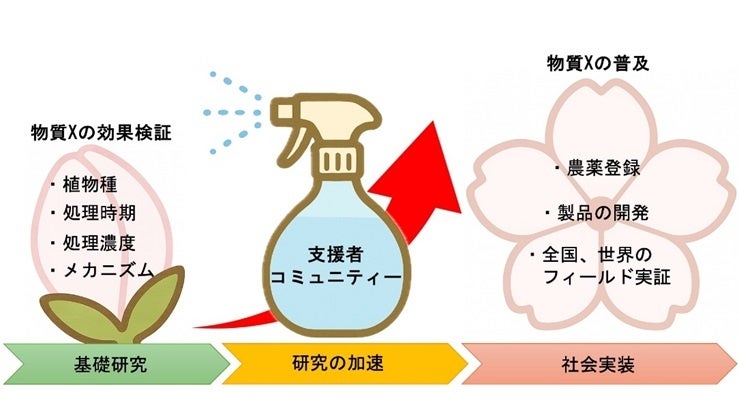 本プロジェクトは、社会実装に向けた第一歩として、正確な物質Xの使用方法の確立・迅速な農薬登録への情報整備・社会の受け入れ態勢の構築を目指しています。そのためには、初期段階における研究資金の確保が重要です。