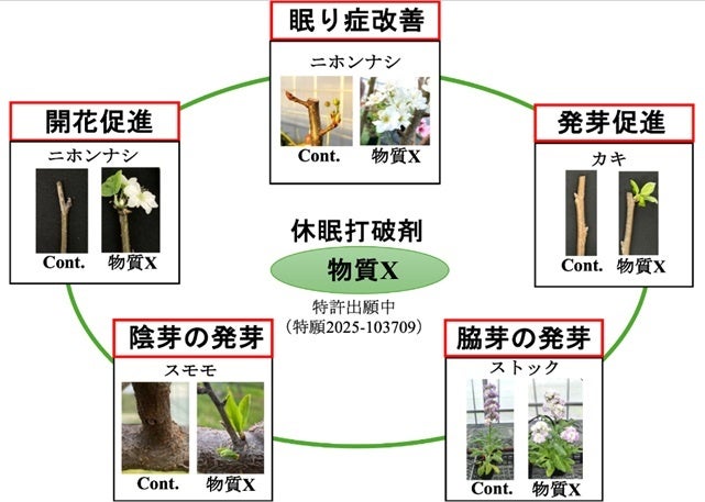 並行して、さまざまな化合物を眠り症常発樹に処理し、開花・発芽促進をもたらす休眠打破剤「物質X」を発見しました(特願2025-103709)。物質Xは毒劇物に該当せず、一般の「普通物」として扱える安全性の高い化合物です。