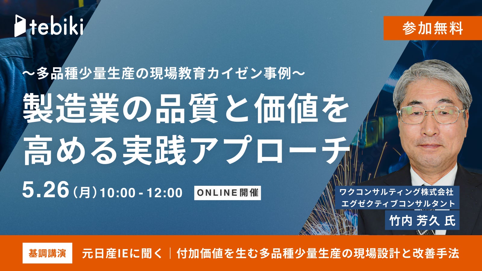 デスクレスワーカー向け現場支援システムtebikiを提供するTebiki株式会社(本社:東京都新宿区、代表取締役:貴山敬)は、多品種少量生産の製造業における人材育成をテーマにしたカンファレンスを、2025年5月26日(月)にオンラインにて開催いたします。