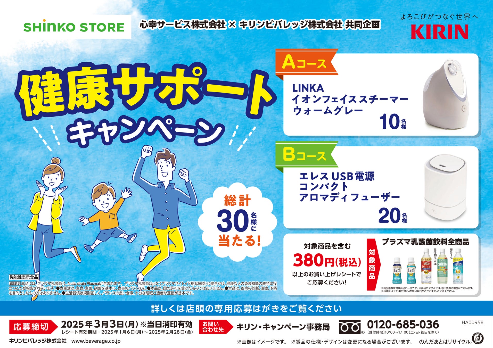 兵庫県尼崎市に本社を置くオフィスコンビニ設置・運営の心幸サービス株式会社(本社:兵庫県尼崎市、代表取締役:山﨑 忠、以下「心幸サービス」)は、全国約200店舗の従業員専用コンビニ「心幸ストア」にて、キリンビバレッジ株式会社 近畿圏統括本部(統括本部長 有馬正剛)と共同で、ライフスタイル応援グッズをプレゼントする「健康サポートキャンペーン」を、2025年1月6日(月)から2月28日(金)までの期間限定で実施いたします。