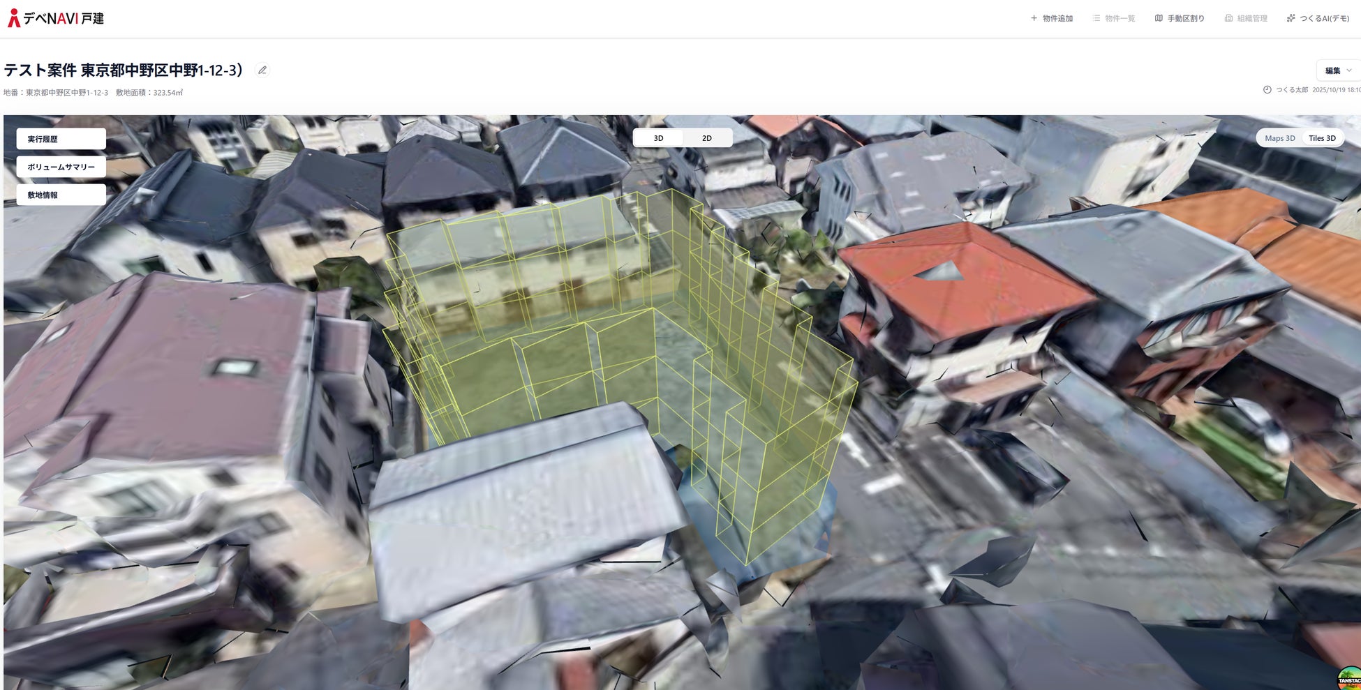 また、戸建検証用に特化・最適化された高度なボリュームチェック機能を搭載しており、道路斜線や母屋下がりなどの複雑な制限を反映した上で、3階建てプランの成立可否を最終確認レベルで即座に判定可能です。算出された結果は3Dおよび2Dで地図上の敷地へ直接投影されるため、一目で成立可否を視覚的に判断することができ、スピード感が求められる仕入れの現場における迅速な意思決定を強力にサポートします。