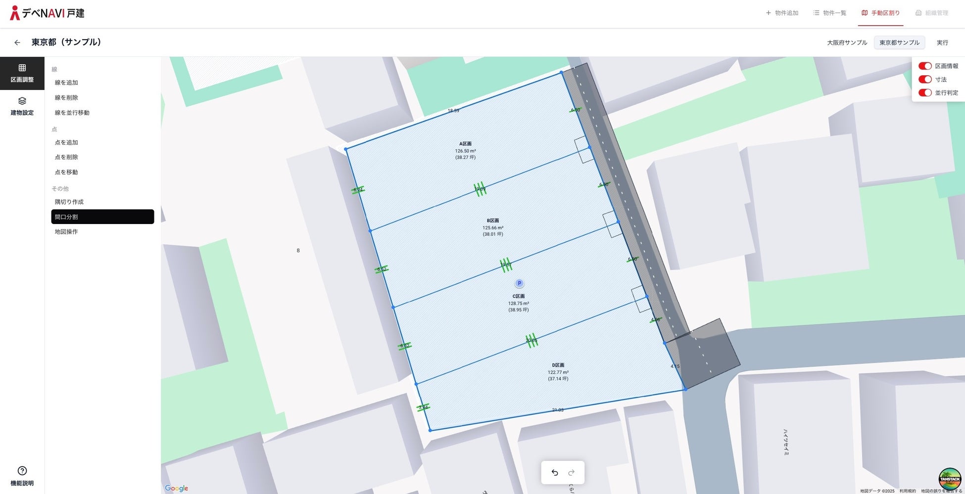 本サービスの大きな特徴は、地図上で地番を選択するだけで、東京23区や横浜・川崎・京都・大阪といった主要エリアの法令制限を自動取得できる点です。加えて、直感的に操作できるUIによりスムーズな区画割作成が可能となり、従来は20分から30分を要していた敷地起こし作業を劇的に短縮することで、現場担当者の工数削減に貢献します。