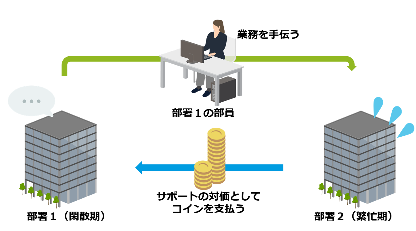 本制度は、繁忙期で人手が足りない部署が社内イントラネットを通して求人依頼を出し、余裕のある部署がその仕事を手伝い、対価として社内通貨のコインがもらえる仕組みです。