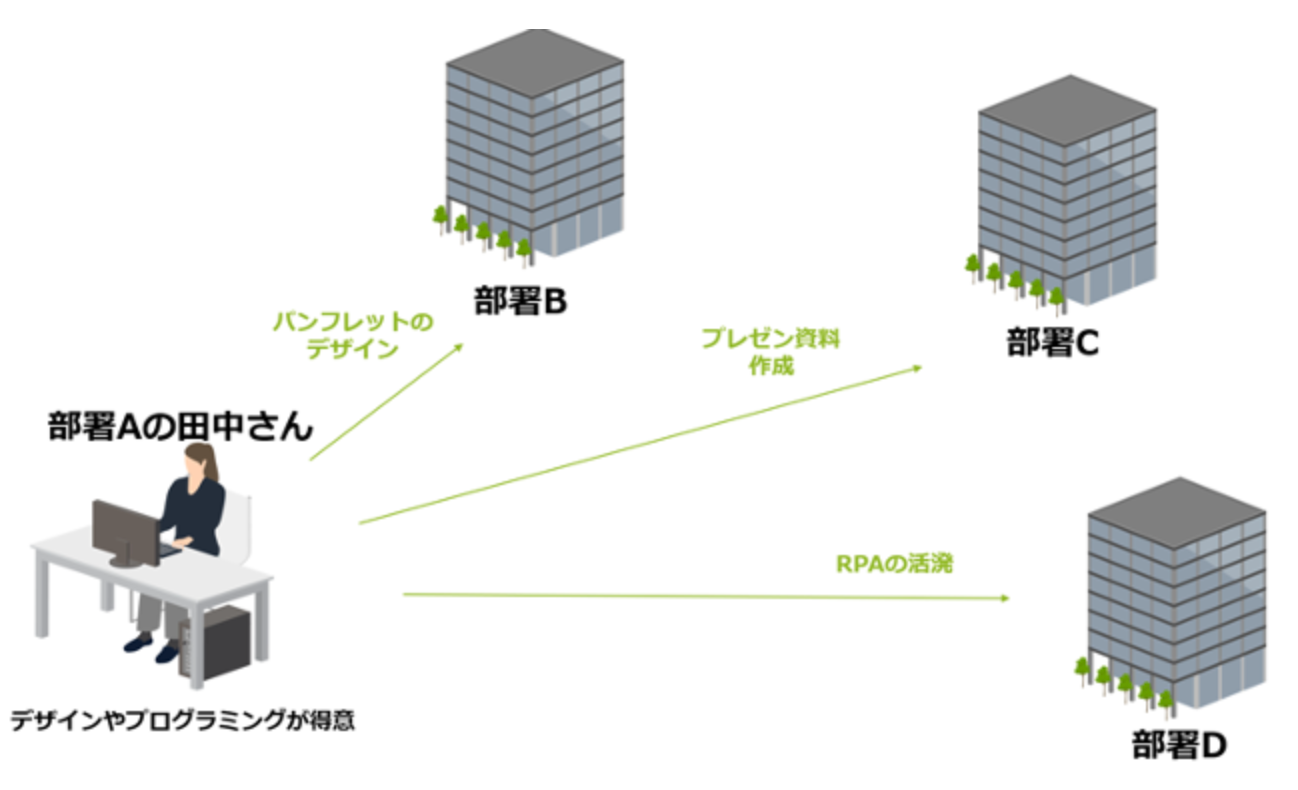 部署や地域を越えて仕事を手伝うことで、社員が自分の得意分野や経験を活かせます。社内で多様な業務に関わることができ、社員のスキルアップにつながります。