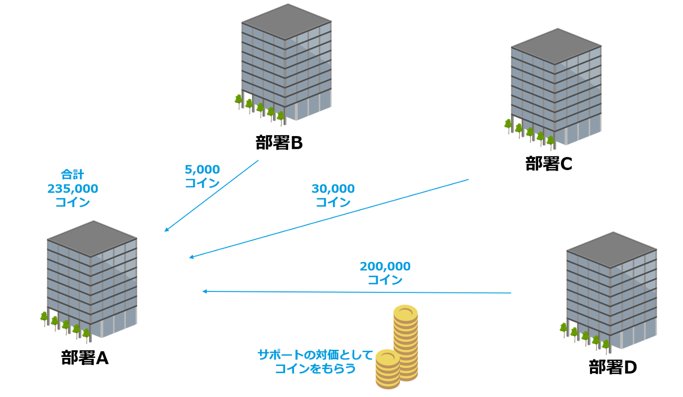 コインは1コイン=1円相当の社内ポイントとして運用されます。業務を依頼した部署がコインを支払い、支援した部署がコインを受け取る仕組みです。コインの実績は部署ごとに集計され、支援実績は全社で共有されており、賞与に反映されます。