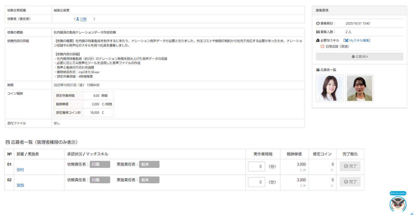 依頼主の部署ではプロモーション用に動画を作成する必要がありましたが、スキルのある社員がおらず、さらに納期・予算の関係で外注が難しい状況にありました。依頼をかけたところ、動画編集やAI音声化が得意な社員が見つかり、動画作成をサポートしてもらうことができました。