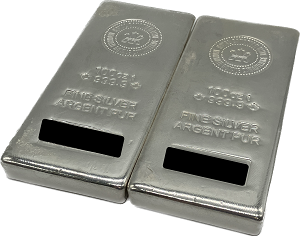 純銀のインゴットでございます。2本で総重量は6kgを超えます。去年の10月に銀相場も100円を突破し、密かに注目されています。