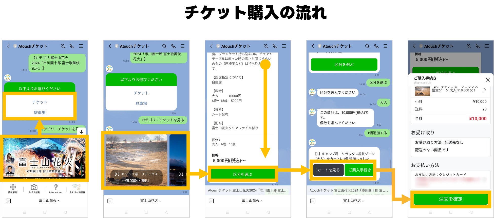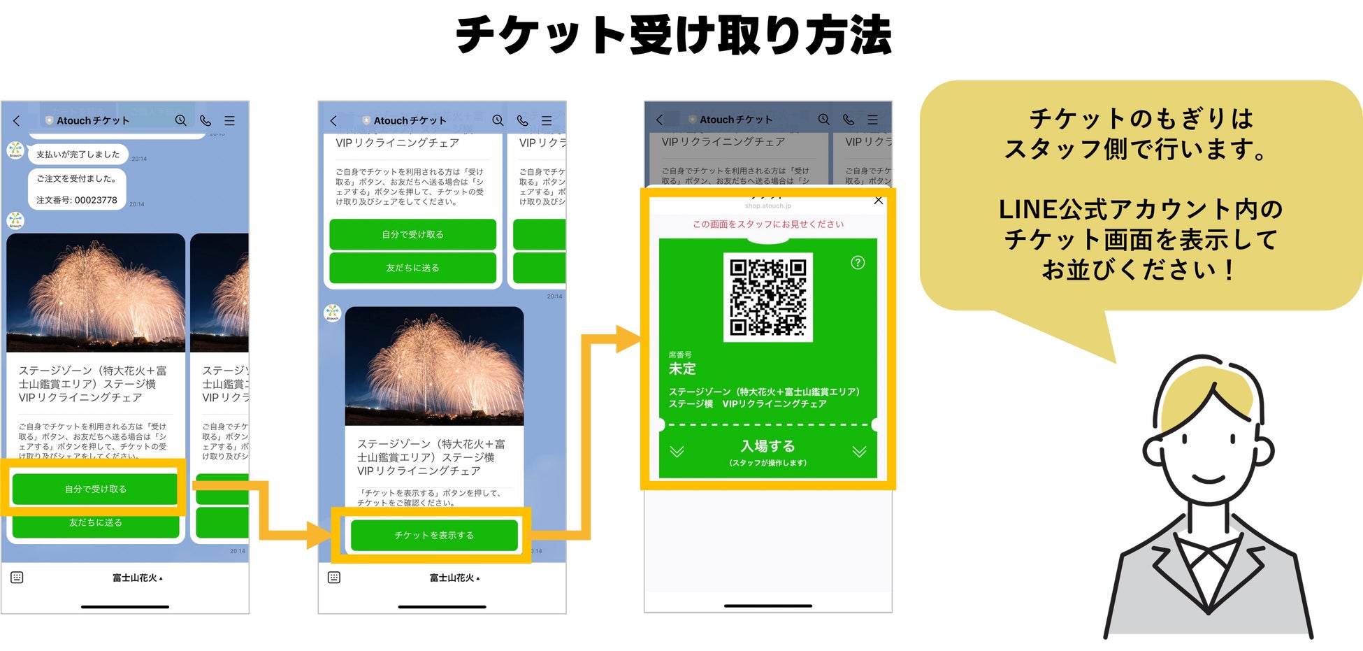 LINE公式アカウント「@fujisanhanabi」を友だち追加後、トーク画面内のリッチメニューから電子チケットを購入可能 -