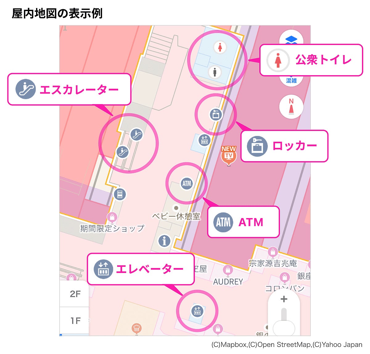 屋内地図が利用できる構内や施設では、地図左下にフロア切り替えボタンが表示され、確認したいフロアをタップし、地図を拡大すると、テナント名も店舗ごとに表示されます。また、テナント名以外にも、改札や出入り口、公衆トイレ、エレベーター、ATM、コインロッカーなどの情報も掲載しています。