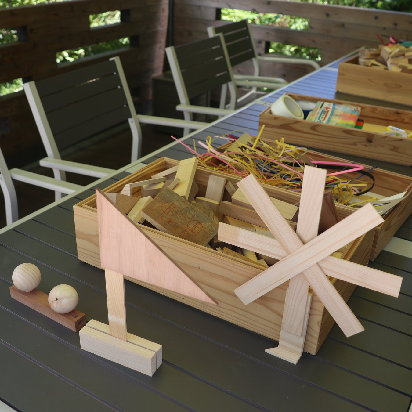 小田原の木工所から、端材をたくさん運んできます。革や紙など他の端材も集めて、描いたり貼ったり自由に遊べるスペースで、オリジナル作品づくりにチャレンジできます。