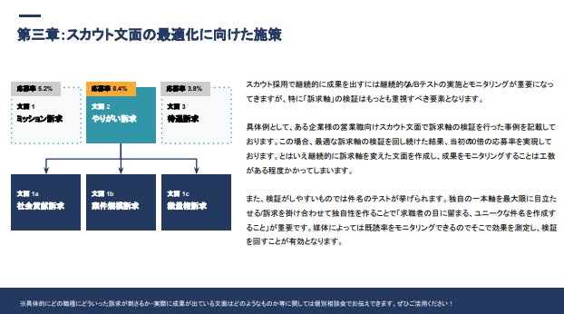 「スカウト文面の書き方」から、「じつは文面よりも応募率に影響を与える重要要素」の解説まで。