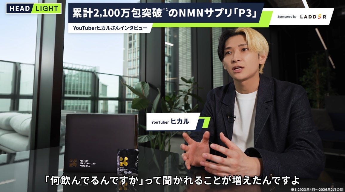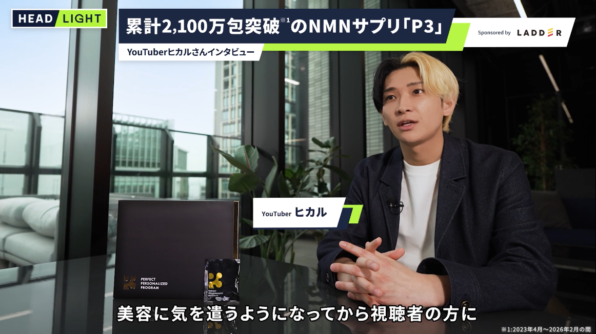 本施策では、ビジネスパーソンや美容・健康意識の高い層が多く利用するタクシー内で、P3の魅力をヒカルにインタビューした動画を放映いたします。