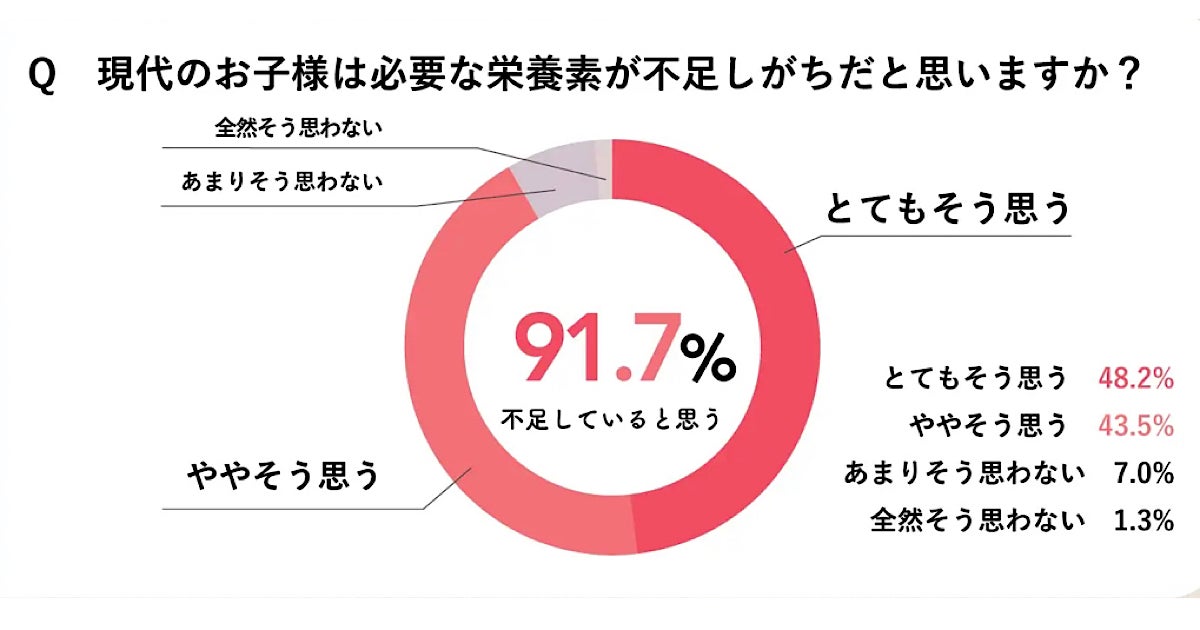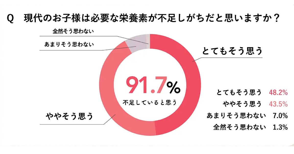 栄養管理士を対象としたアンケートによると、約9割以上の方が現代のお子さまに必要な栄養素が不足しがちだ、と回答。中でもたんぱく質、ビタミン、カルシウムが不足しがちだそう。