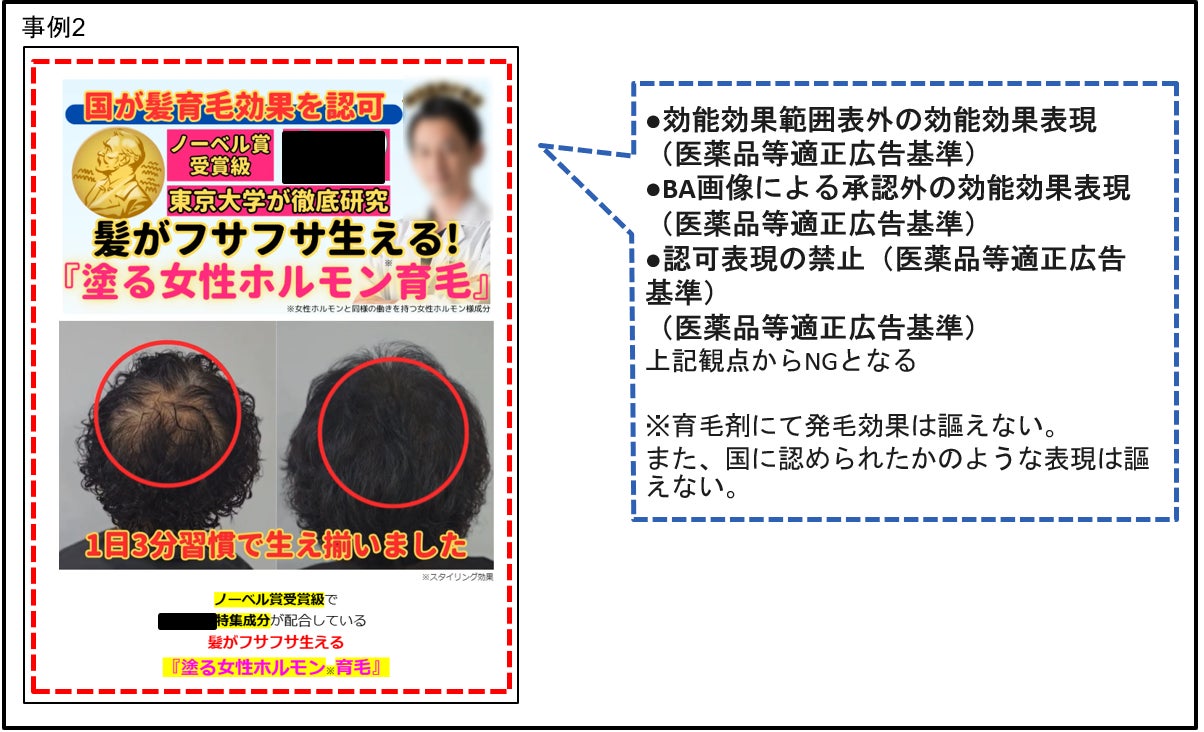 これまでの調査の中で、公的機関から特商法に基づく業務停止命令や景品表示法に基づく措置命令などの行政処分を受けた事業者が複数存在しています。直近、育毛材(医薬部外品)に対する摘発がリリースされ、弊社の過去の調査結果と照らし合わせたところ、公的機関による摘発内容との関連性が確認されました。以下に、その詳細をご報告いたします。